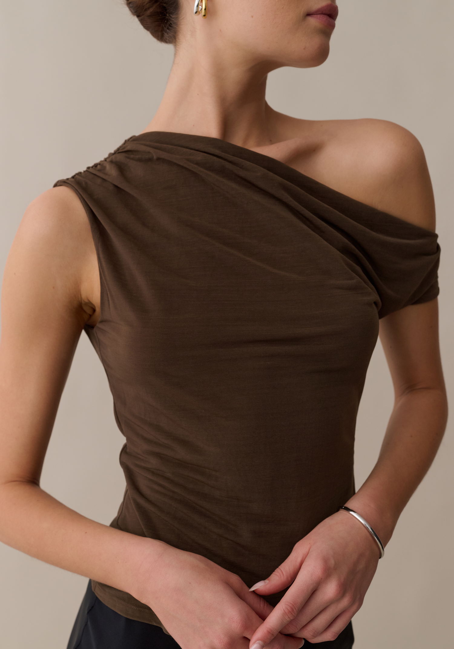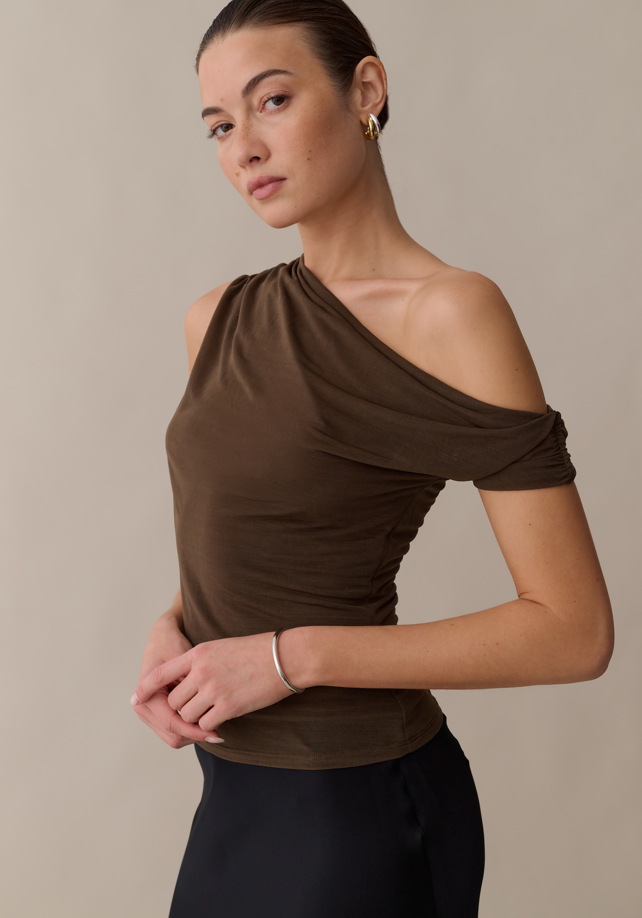 Soft and stretchy yet effortlessly cool, this chic top is perfect way to look polished while feeling comfortable. Done with an off-the-shoulder silhouette and drapey feel for a style you can dress up or down.