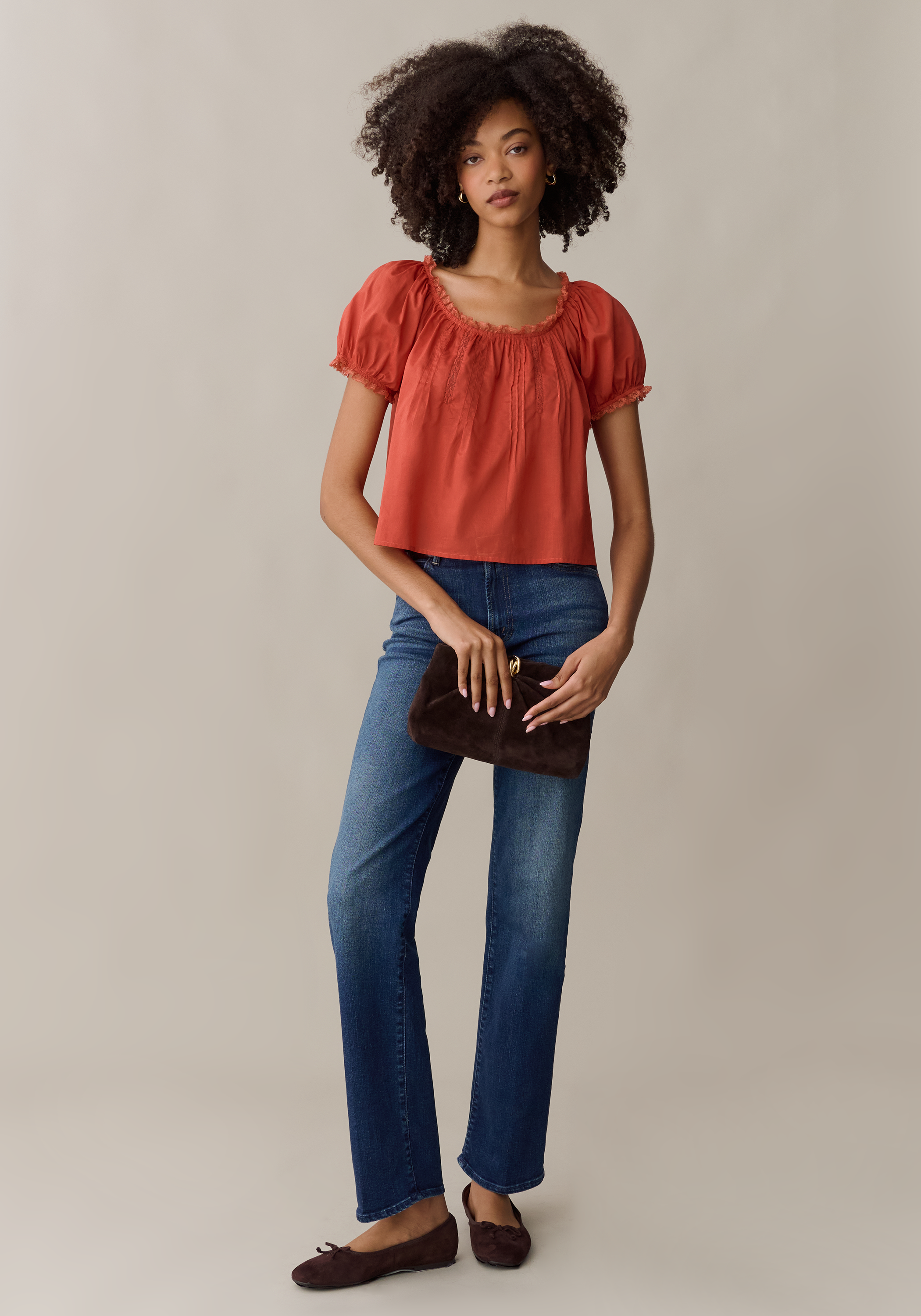 The Isaline Cotton Top is a delicately crafted blouse featuring charming puff sleeves and a light, airy cotton fabric that ensures comfort and breathability. Finished with dainty lace trim and sweet details for an easy, romantic look.