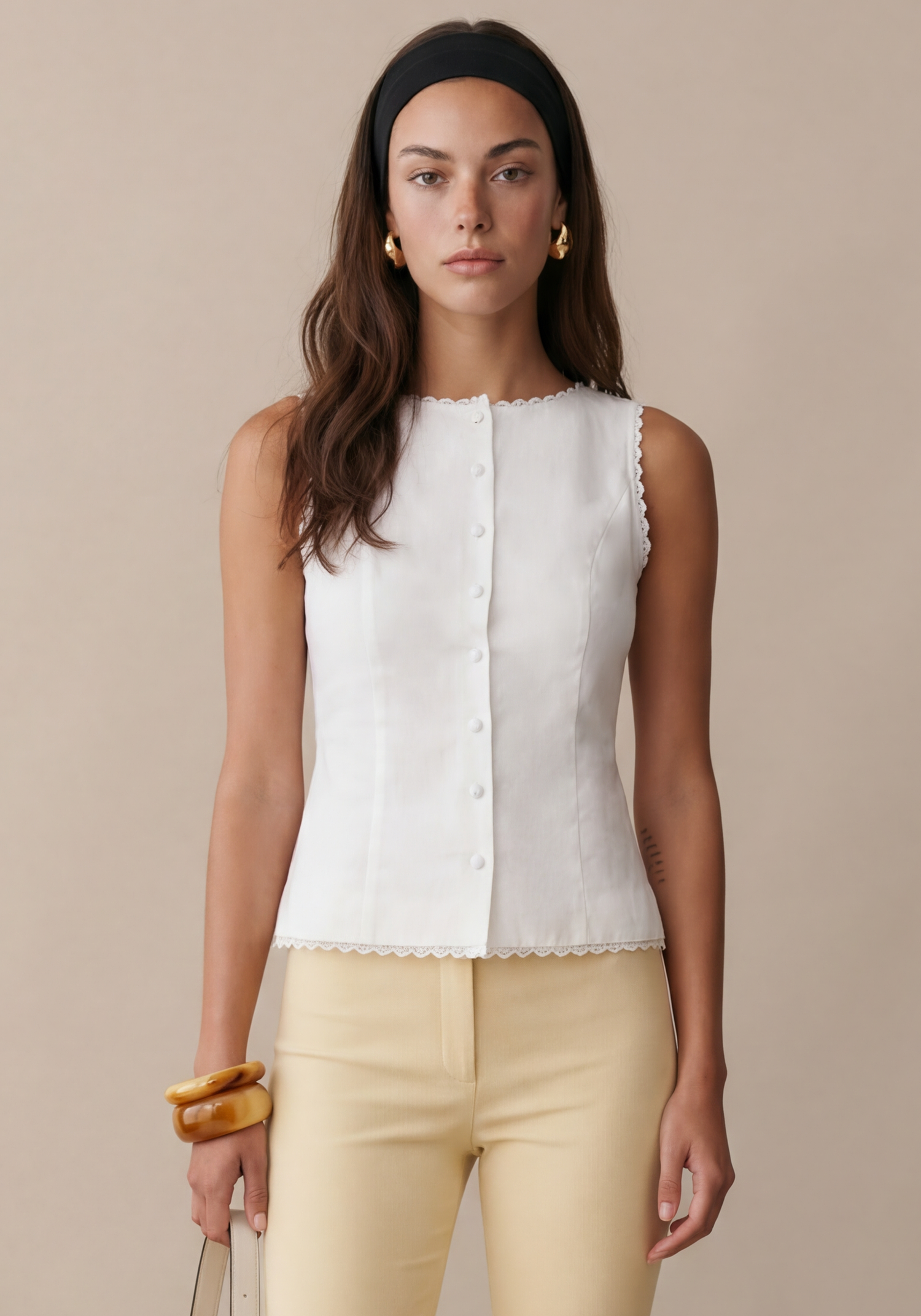 The Micah Top boasts a charming high neckline and adorable lace trim, perfect for adding a touch of elegance to any outfit. Made from a comfortable cotton linen blend, this top also features front buttons and a back tie for an adjustable fit. Elevate your style with this versatile and chic top.
