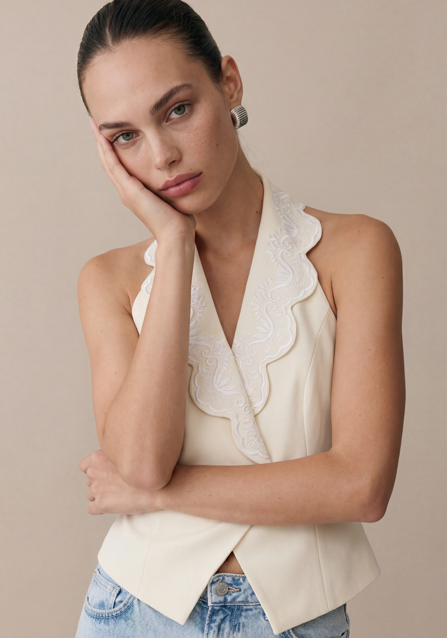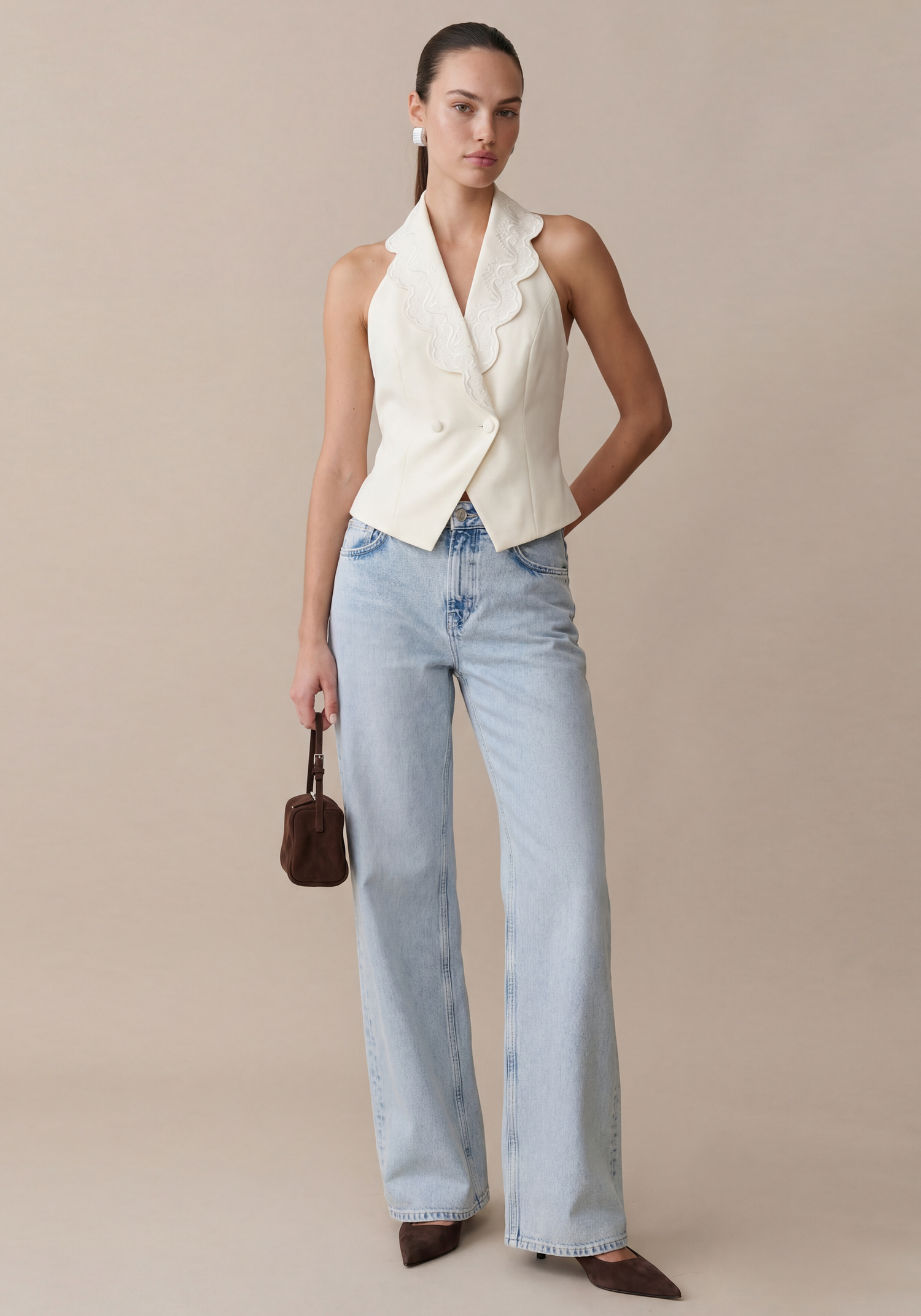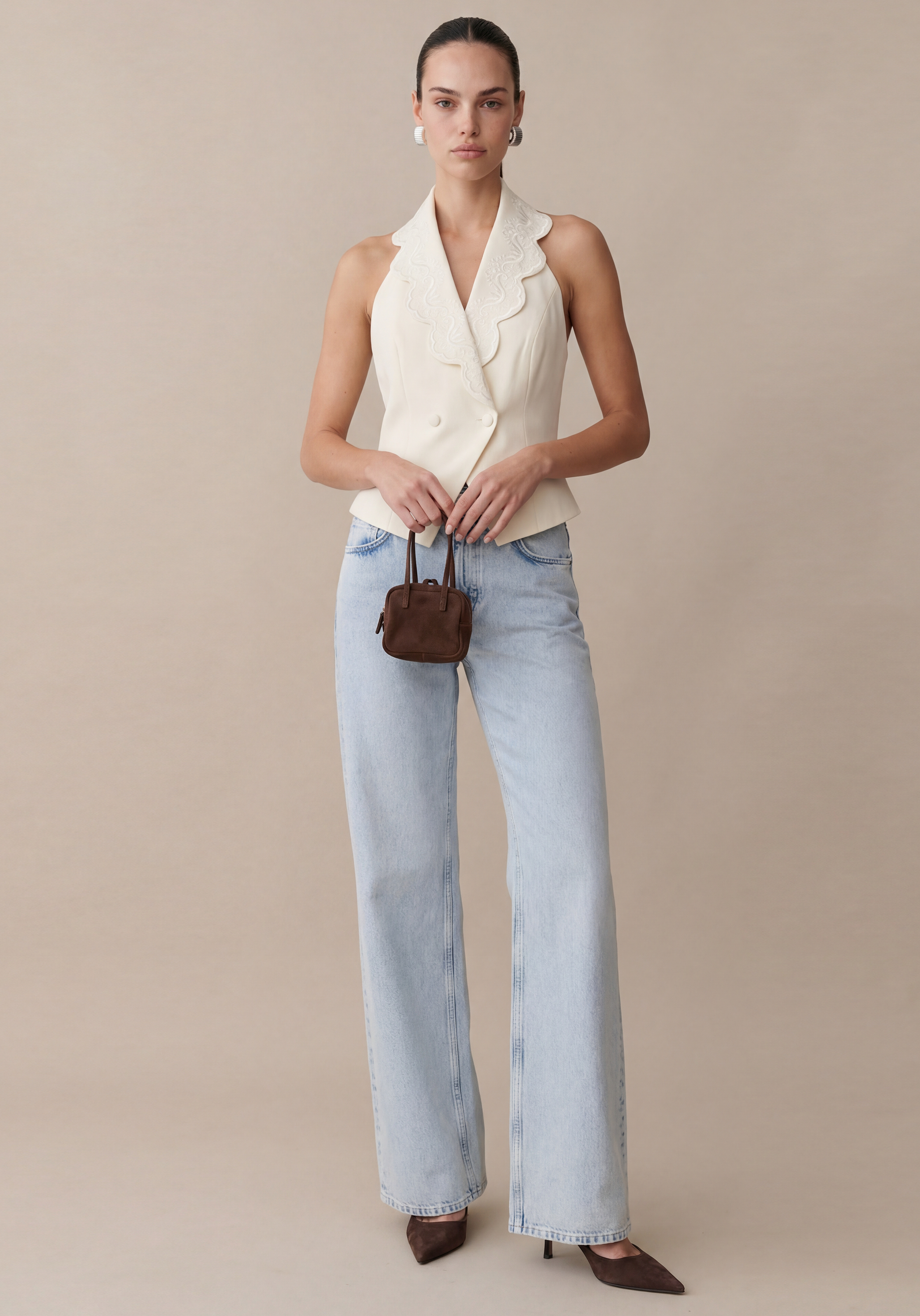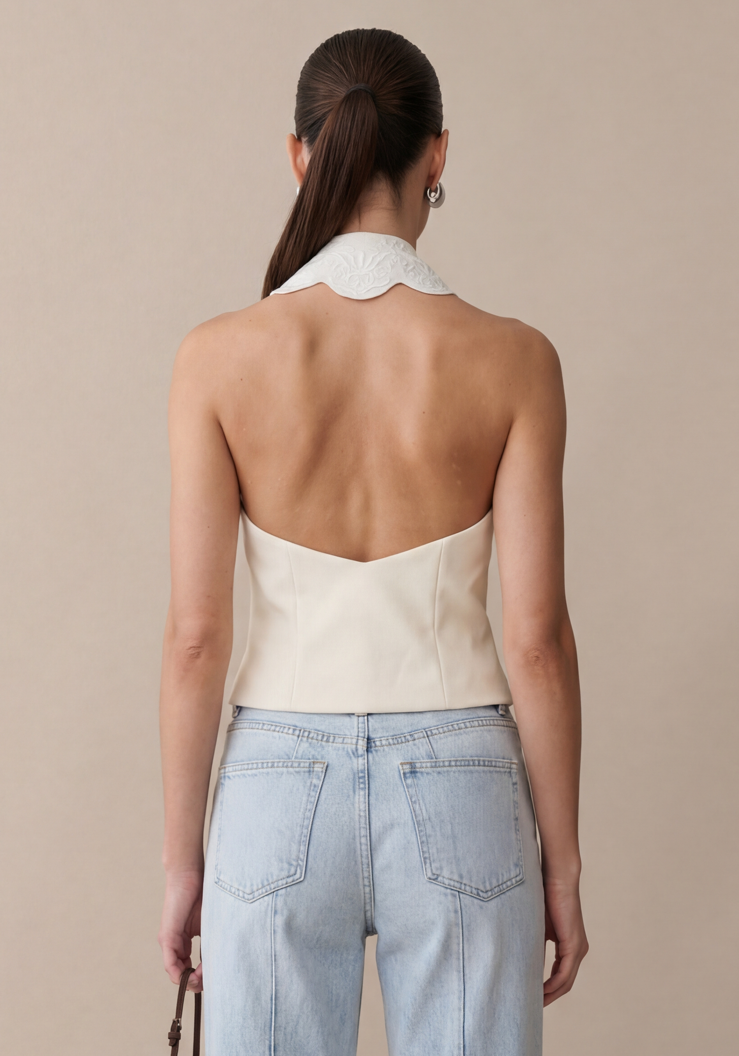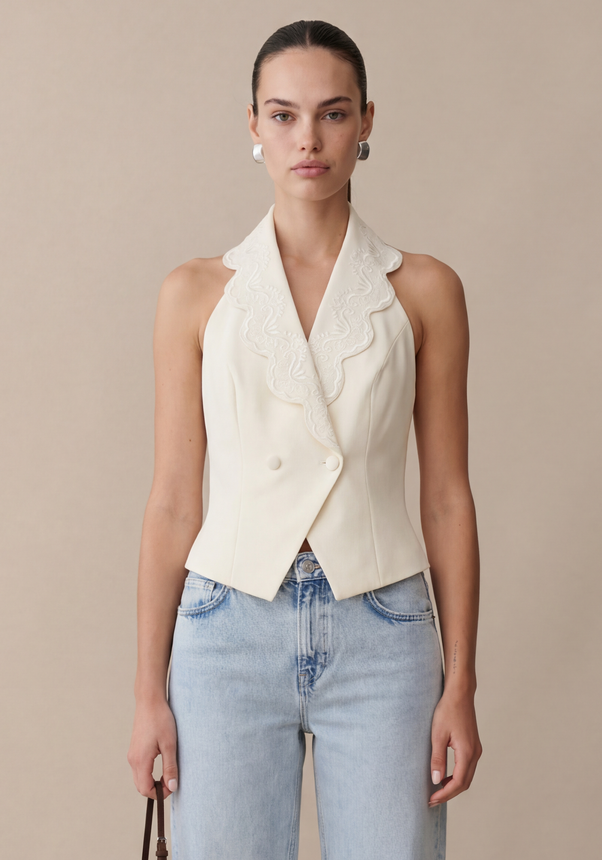 The Mina Vest features a stunning lace-lined collar and a delicate scalloped hem, exuding elegance and sophistication. With front button closures and a dramatic open back, this vest is both stylish and functional.