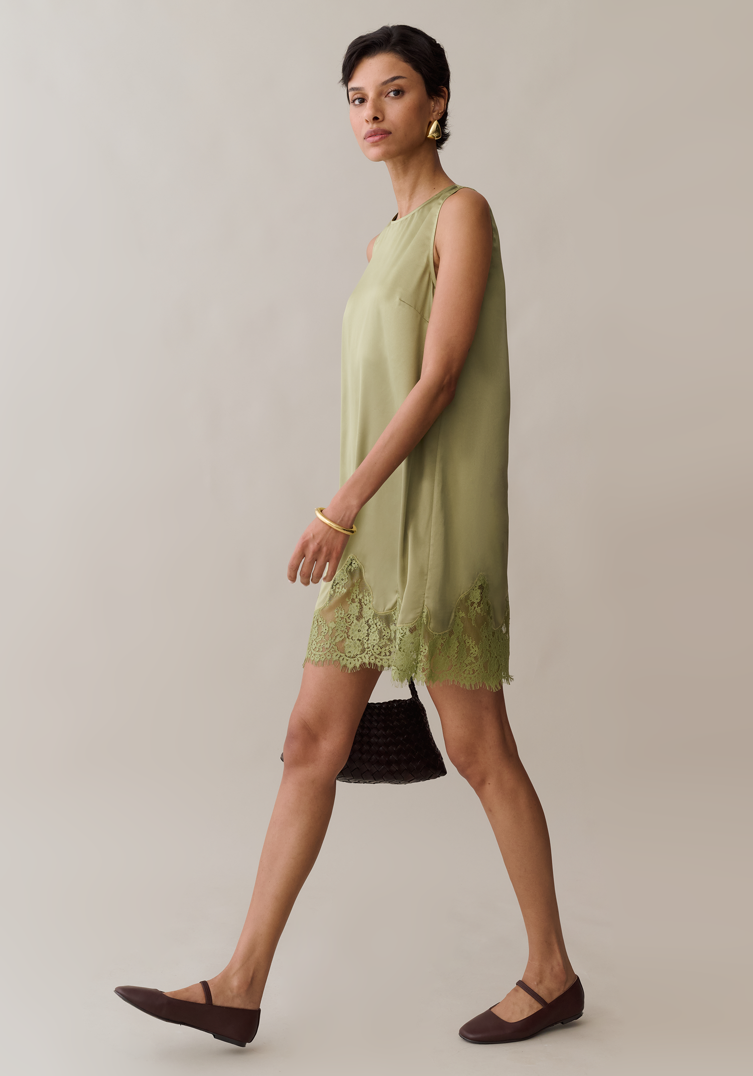 A study in understated elegance, this sleeveless shift dress is cut with a clean, easy silhouette that drapes effortlessly over the body. The minimalist neckline keeps it polished, while the delicate lace hem adds a soft, romantic finish.