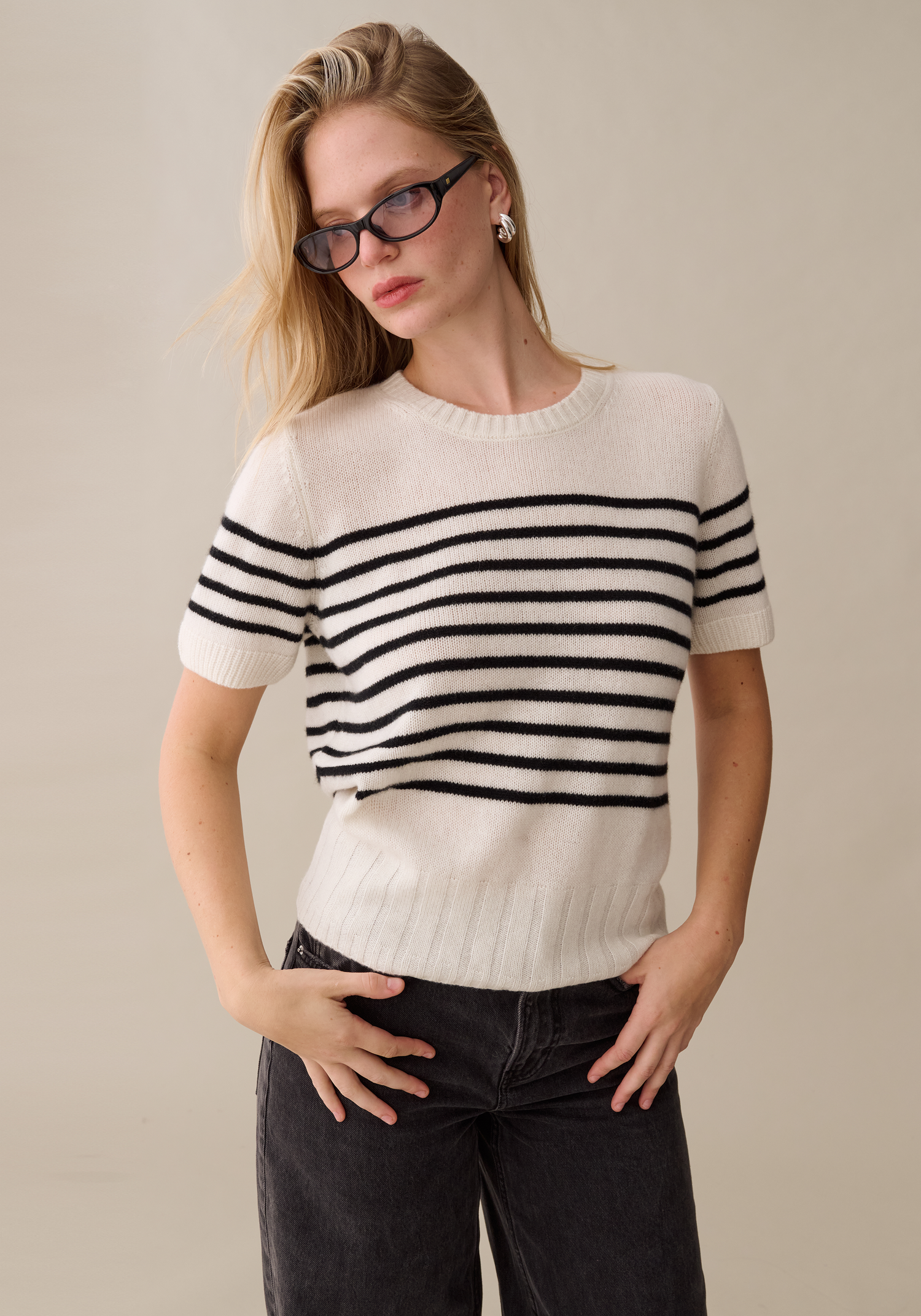 Experience cool and chic comfort with the Arielle Cashmere Sweater. Its short sleeves and black stripes add a touch of style to this super soft sweater made from 100% cashmere. Stay comfortable and fashionable all day long.