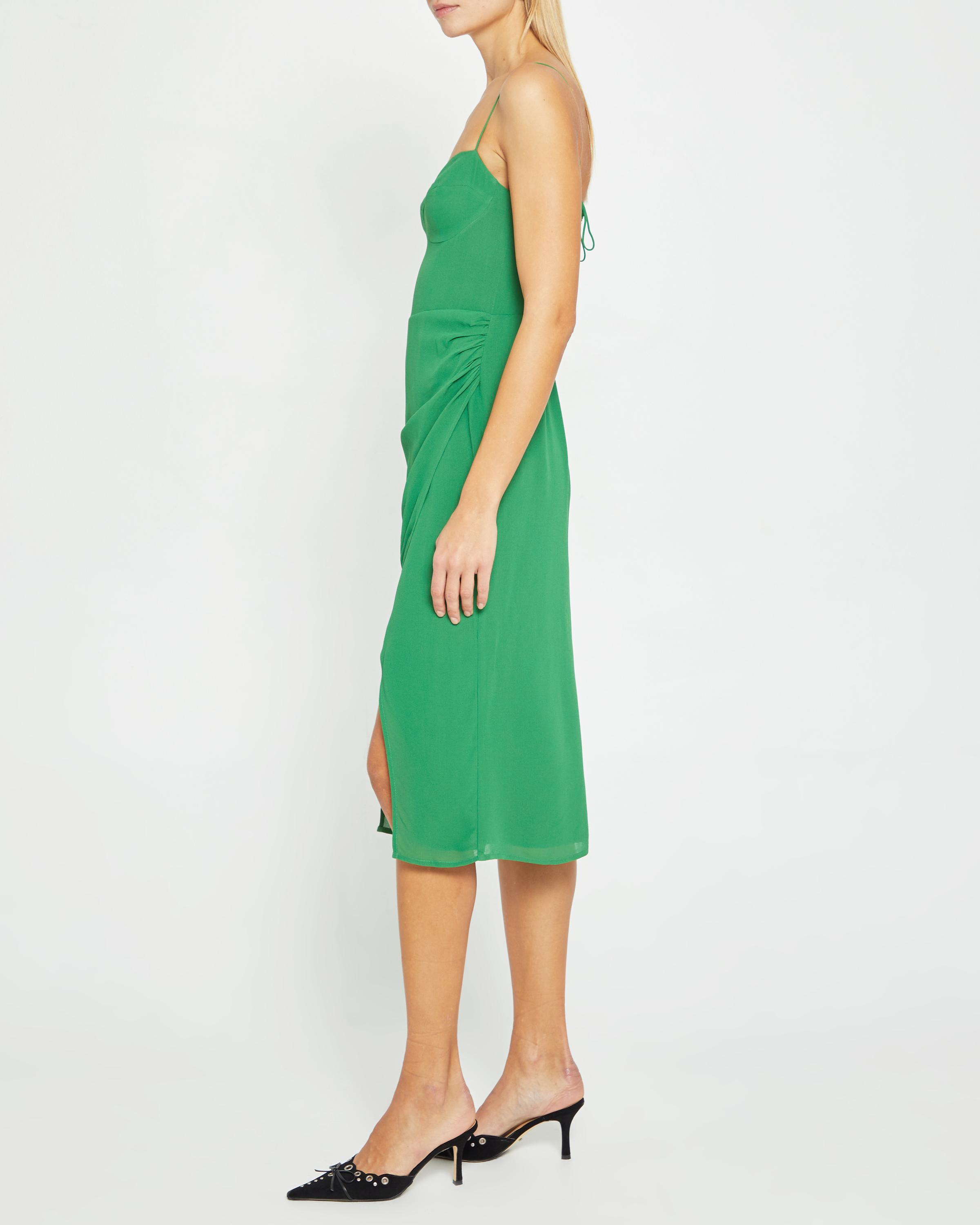 The Emery Dress is a must-have for your special occasions. It features dainty tie straps, a structured bodice, draped skirt, and an elegant slit detail. Crafted from a lightweight fabric, it's comfortable and perfect for any event.
