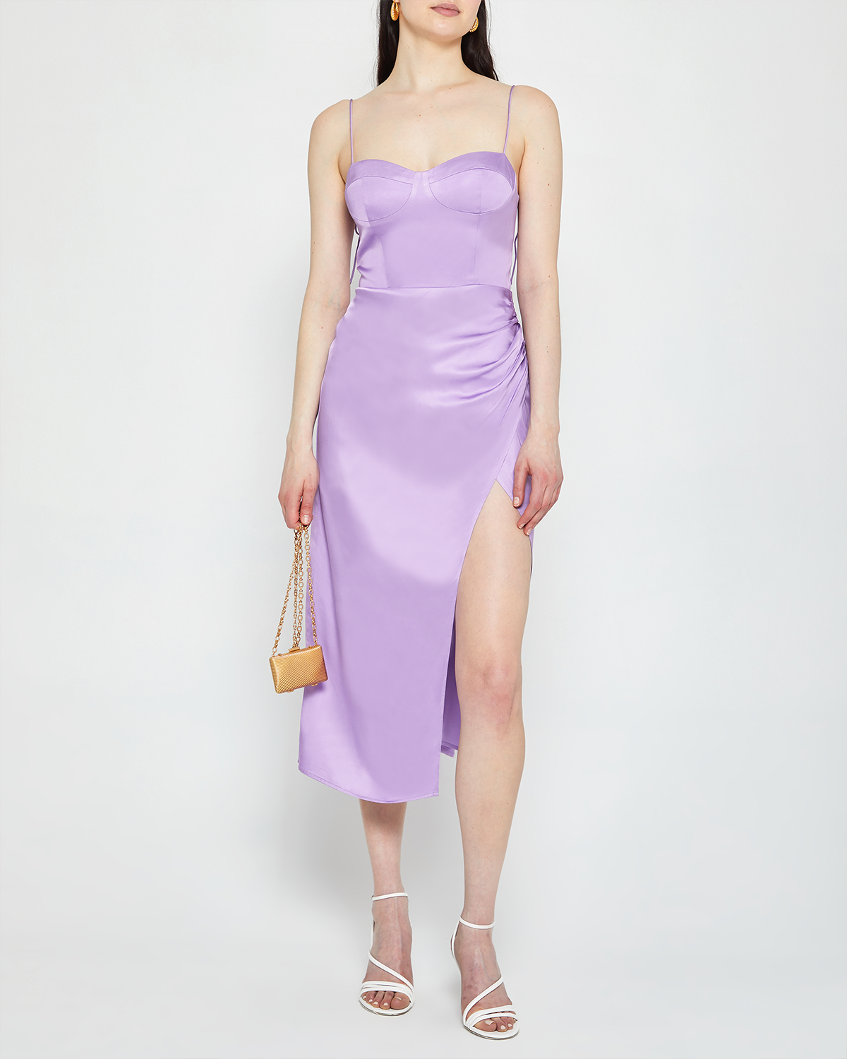 The structured bustier style bodice compliments the draped, wrap style skirt. Finished with dainty details like adjustable tie sleeves.