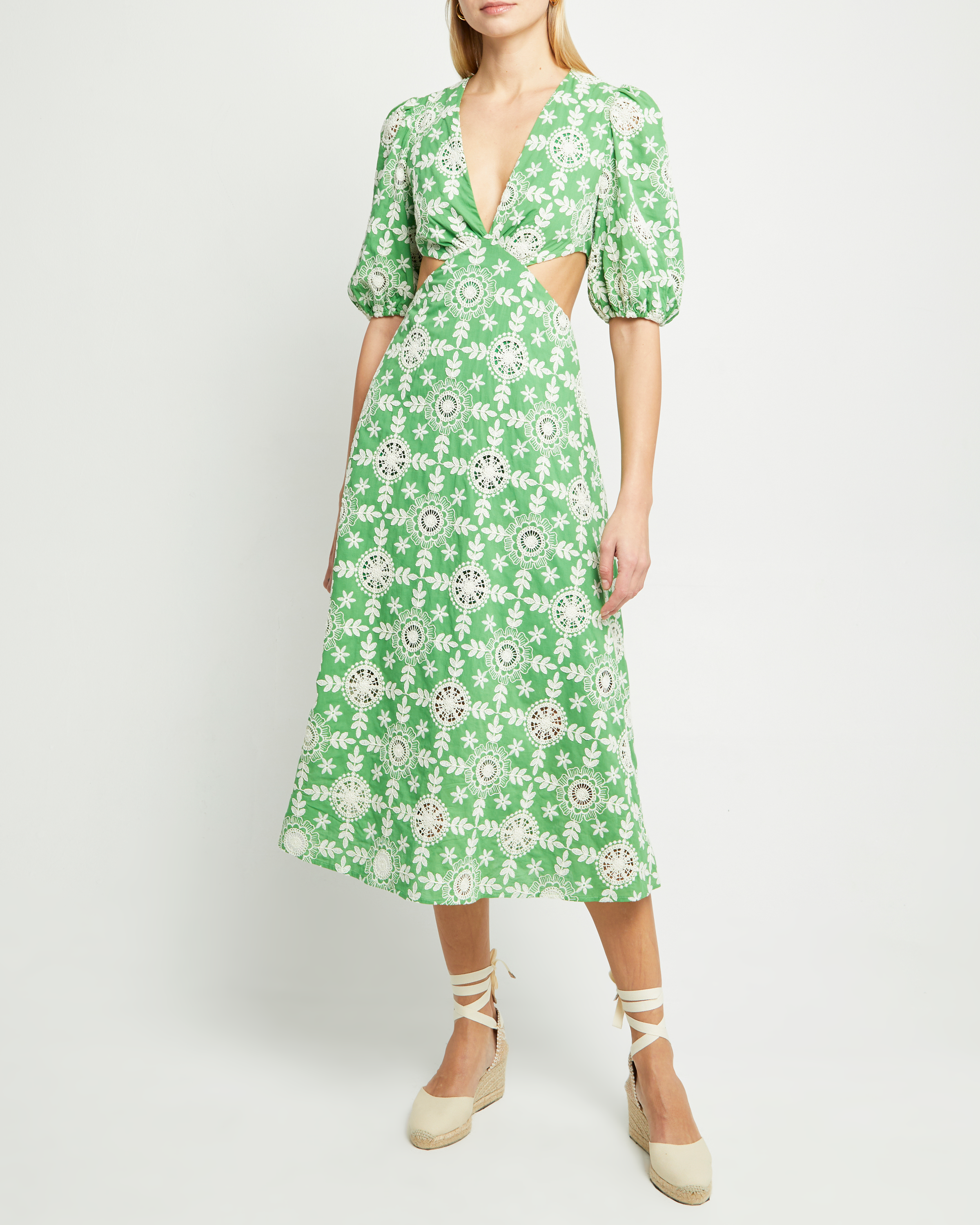 Crafted from vibrant green cotton, this stunning Iris Dress features intricate lace embroidery details and flattering side cut outs. The V-neckline and puff sleeves add a touch of elegance to this must-have dress.