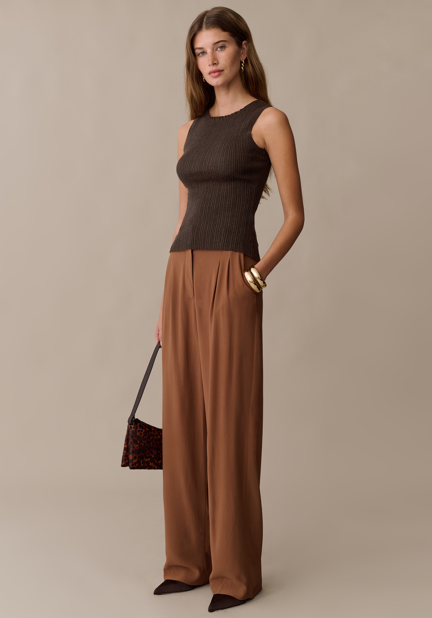 The Nina Top strikes the perfect balance between comfort and style in a luxurious rich brown. Crafted from a ribbed knit with built-in stretch, it hugs your frame with a high neckline and sleek fitted cut that feels intentional.