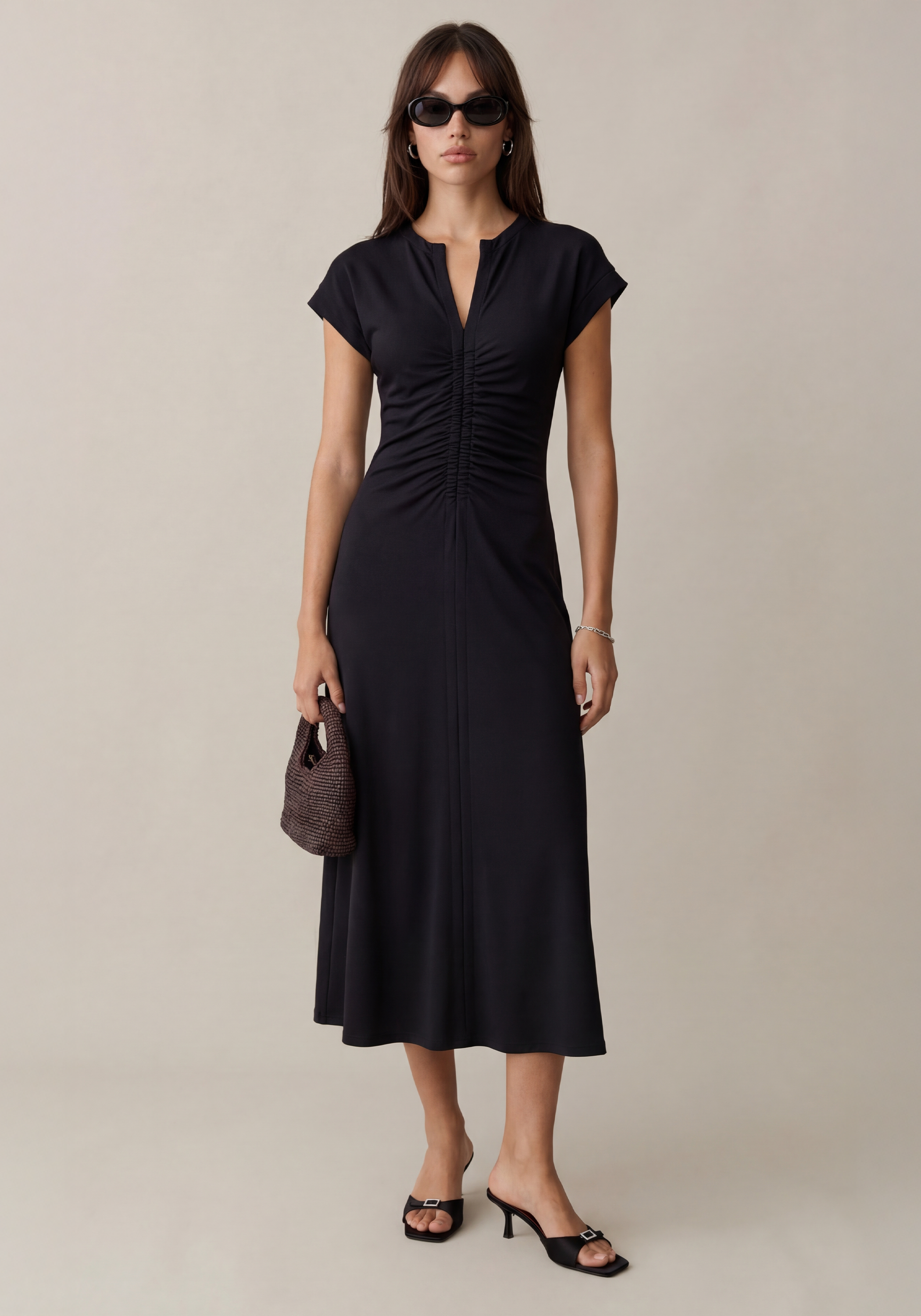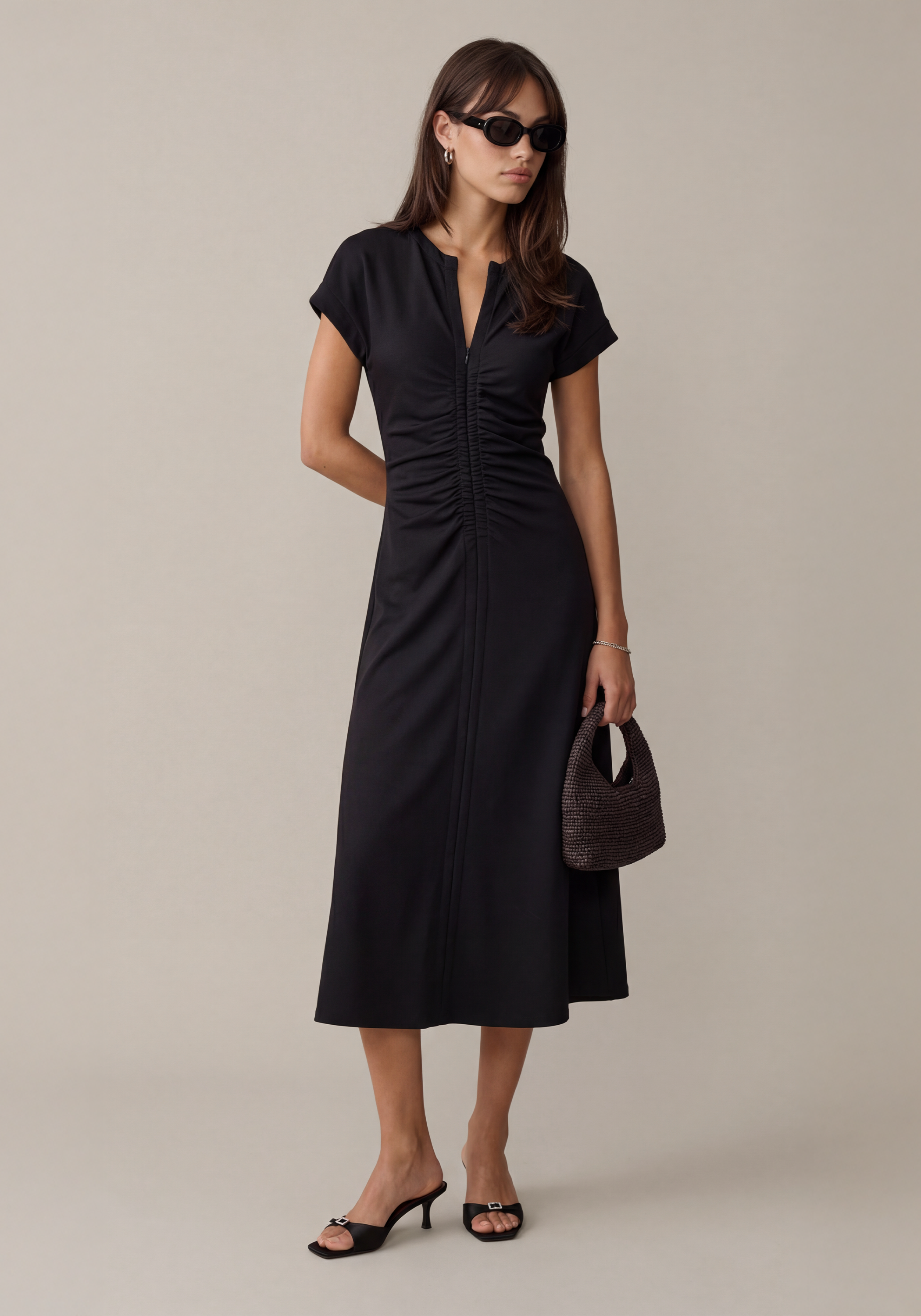 The Roxy Ponte Knit Dress features strategic front and back ruching that flatters your figure, paired with an adjustable front zipper for customized fit. The mid-weight, stretchy Ponte de Roma fabric moves with you, offering comfort without compromise. Effortless elegance for everyday wear.