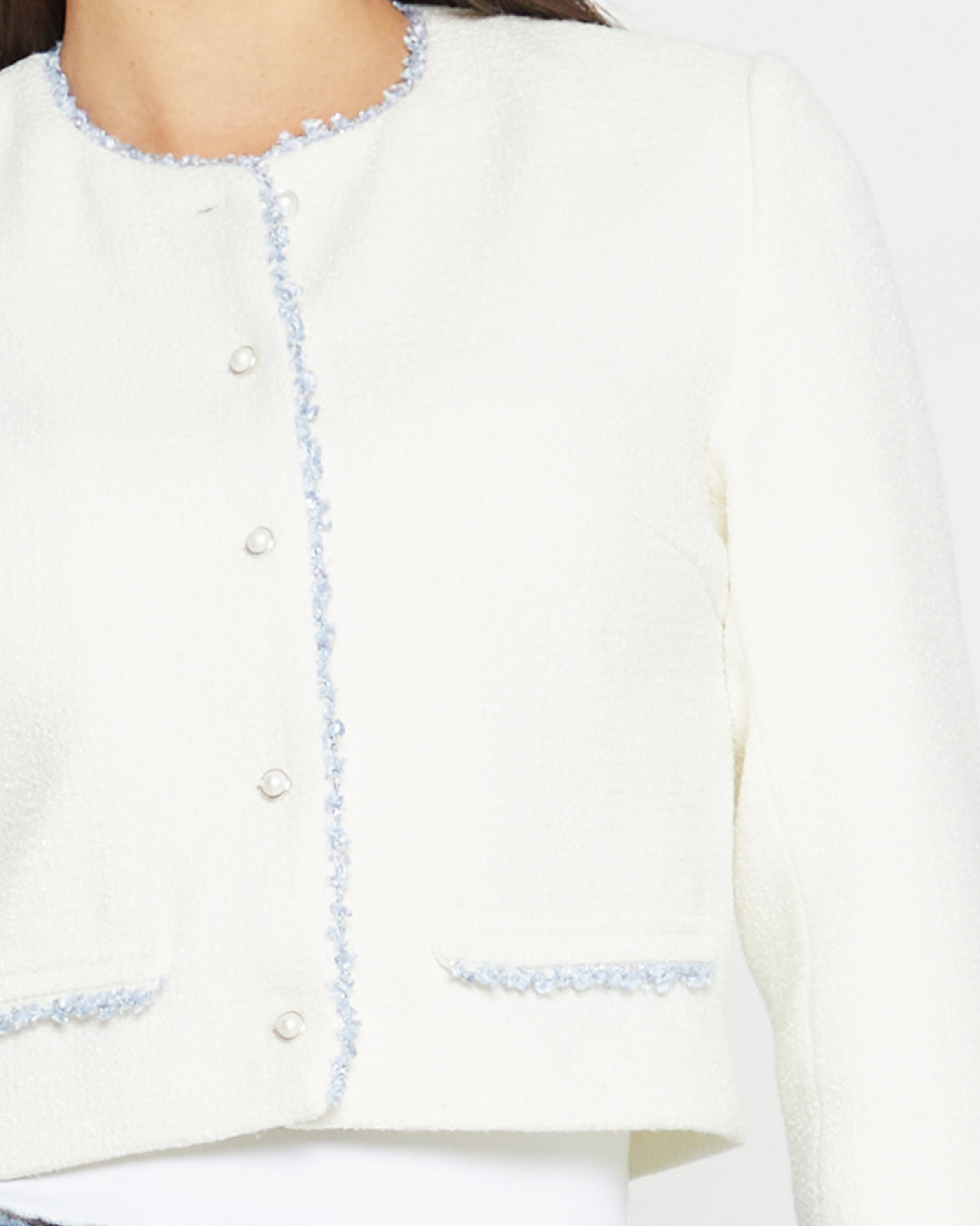 The Beatrice Jacket is a statement piece with its pearl buttons and unique white tweed design. The blue trim adds a touch of sophistication to any outfit. Elevate your style and stand out from the crowd with this one-of-a-kind jacket.