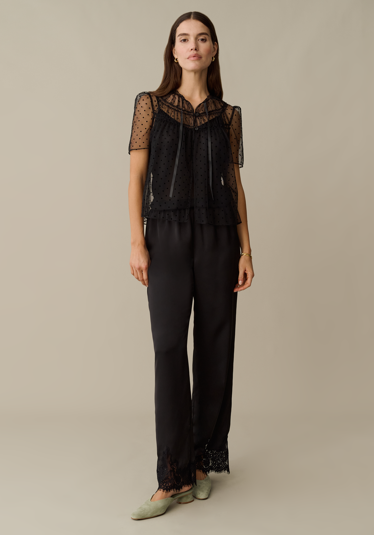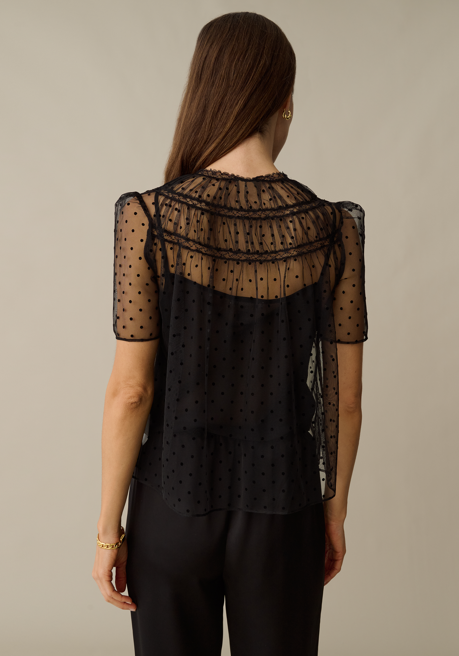 This pretty little blouse is made from a fun, sheer polka-dotted tulle with a charming ribbon neckline and button details. Includes an optional cami slip for versatile styling options.