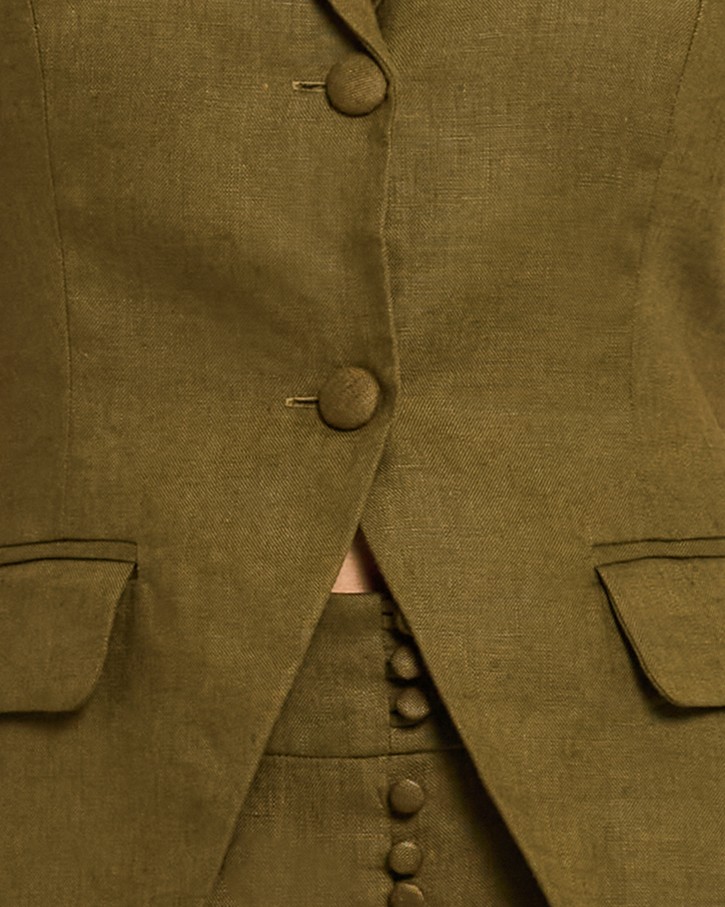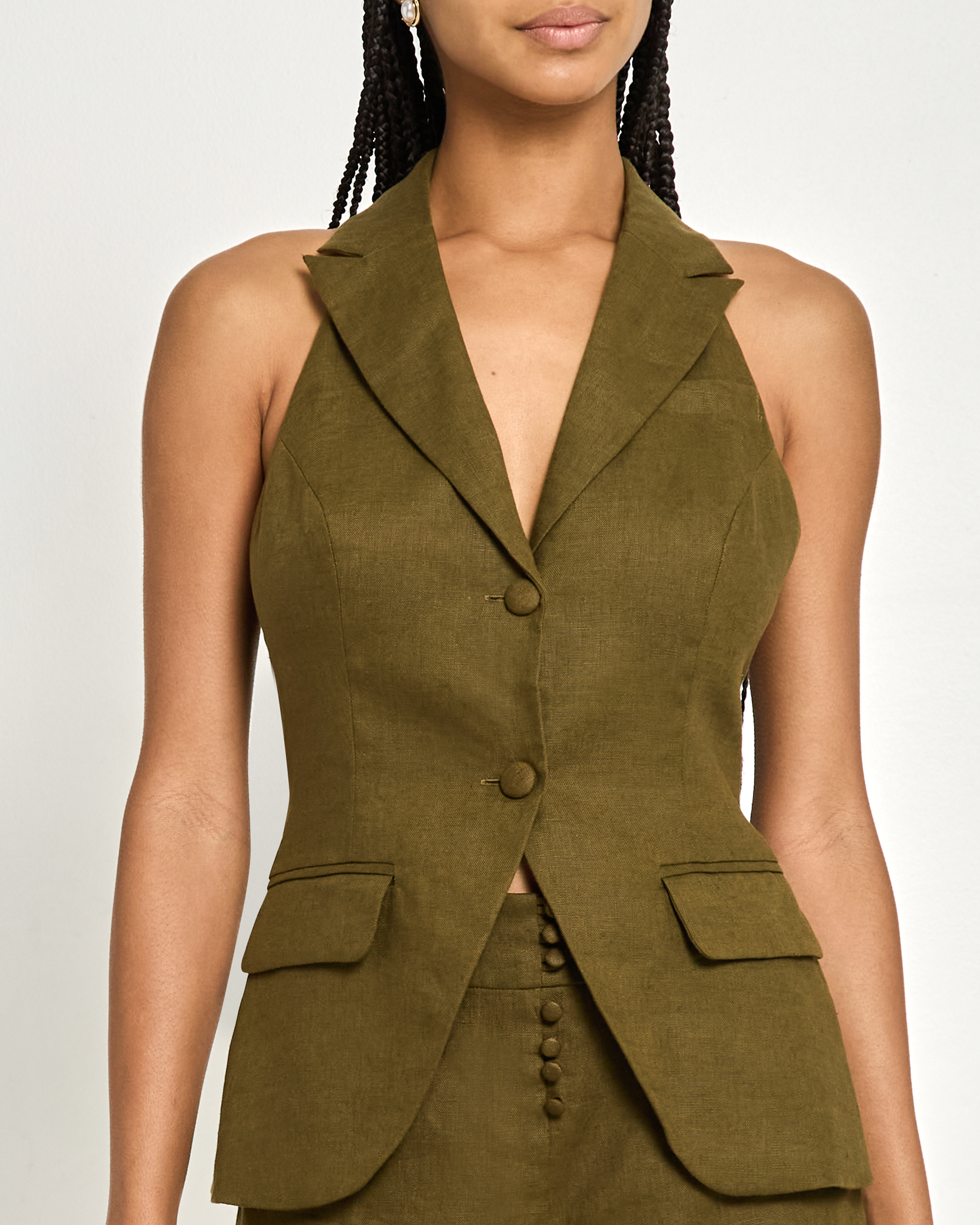 Expertly crafted with stunning linen, the Raphaela Vest Top features a sleek open back and a cool collar detail. Its versatile vest design can be dressed up or down, making it a perfect addition to any wardrobe.
