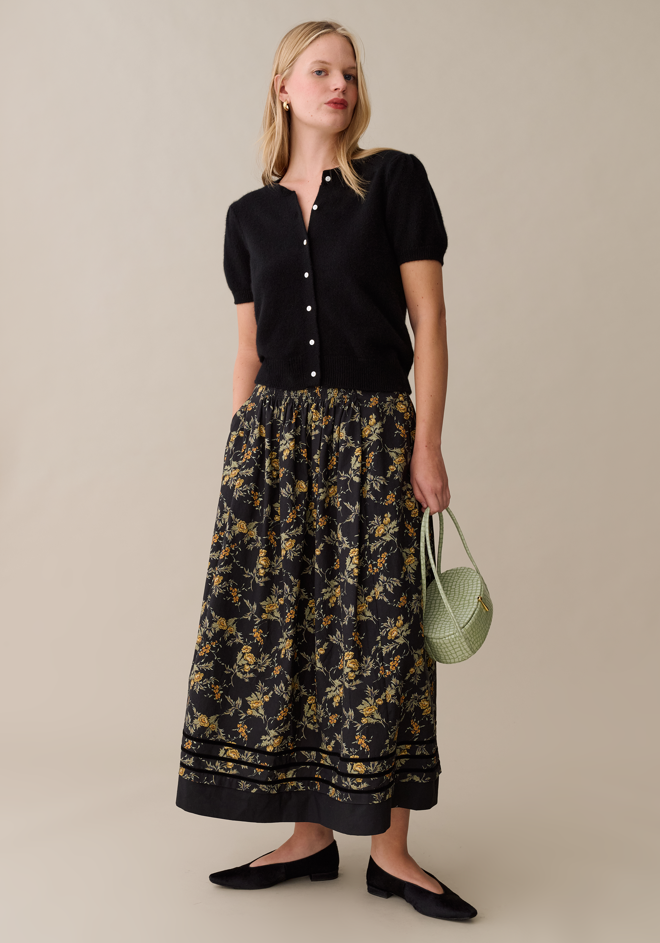 The Viola Skirt features exquisite smocked detailing at the waist, enhancing fit and comfort with a subtle texture. Accented by a luxurious velvet ribbon trim, this skirt is oh so romantic with true craftsmanship vibes.