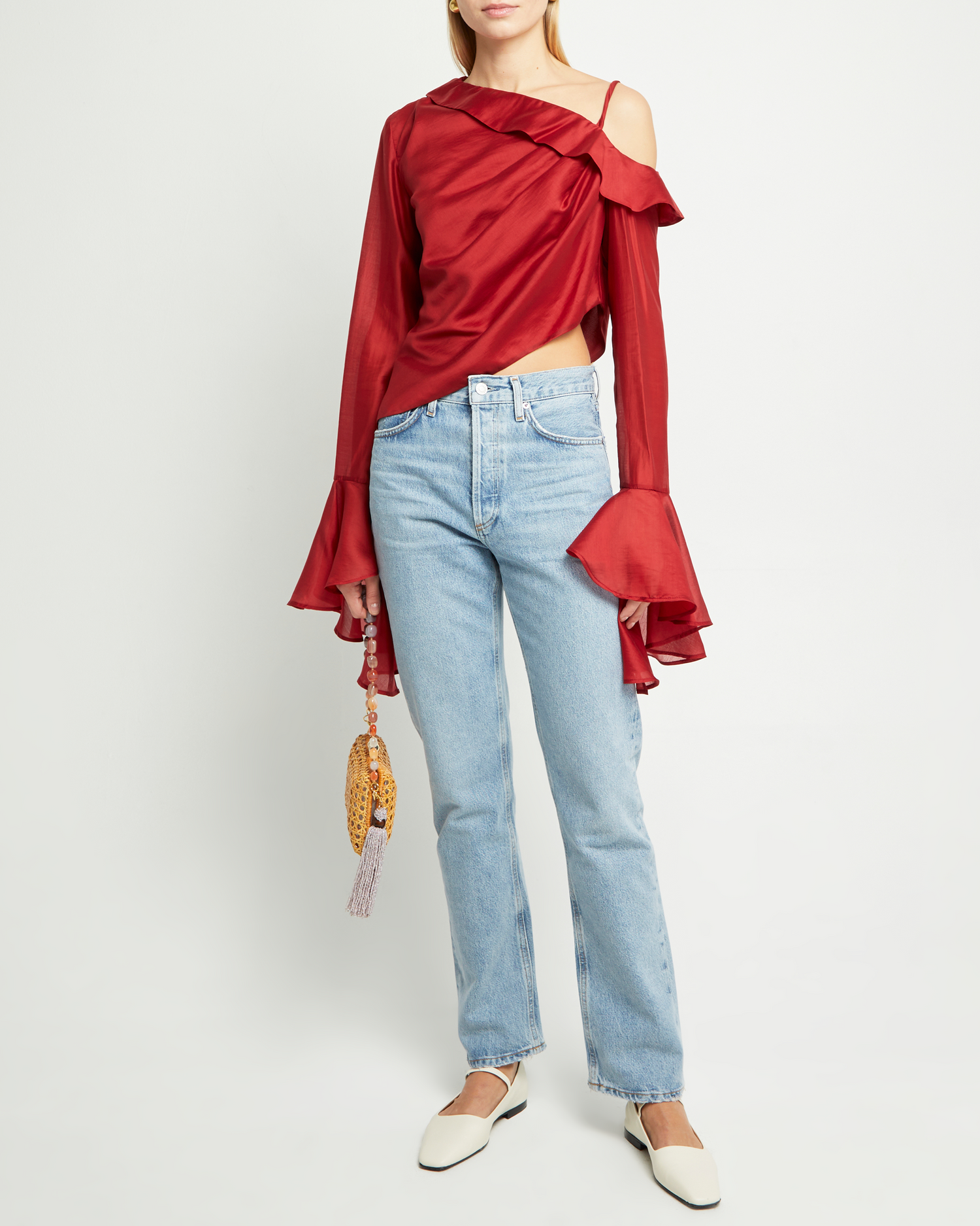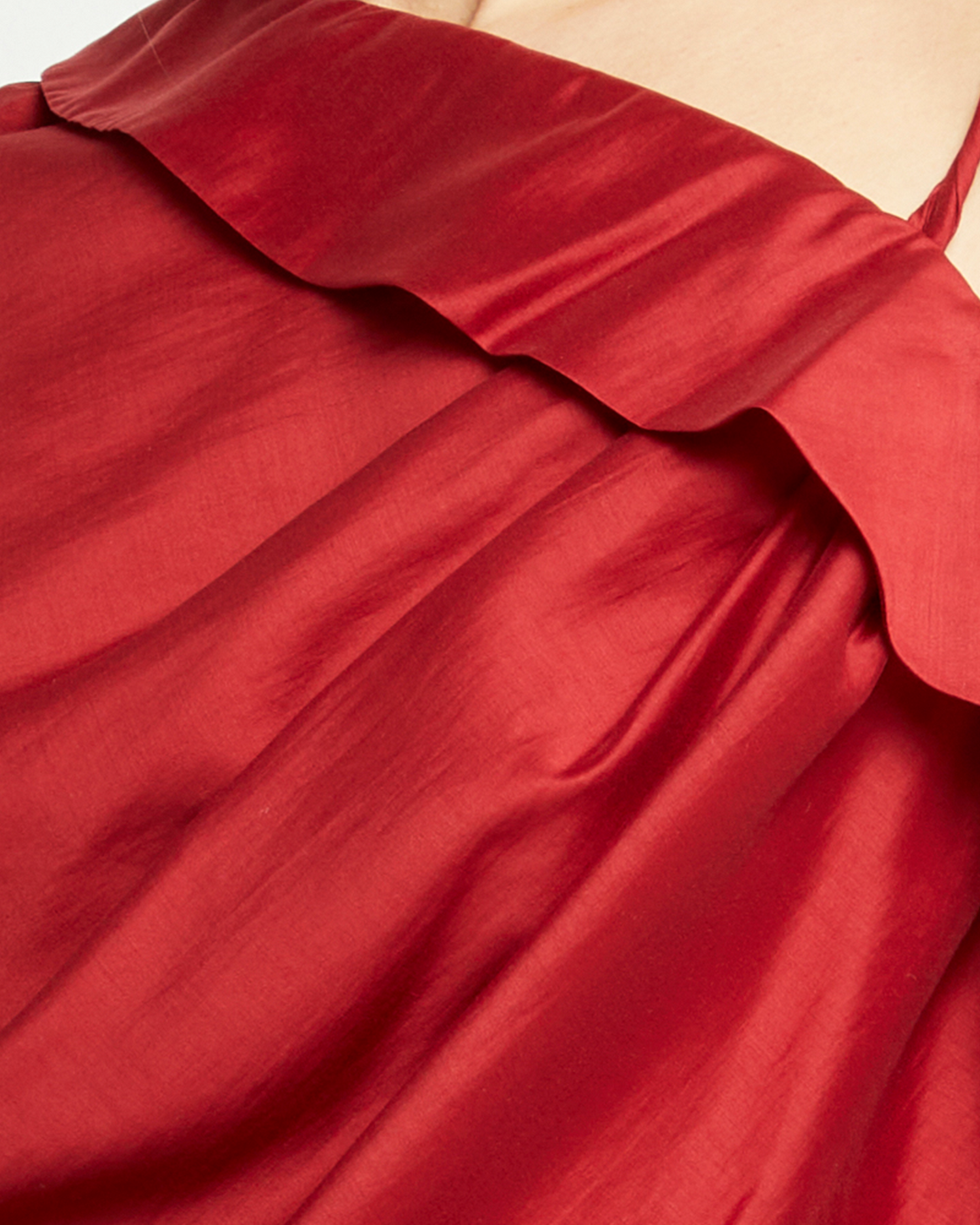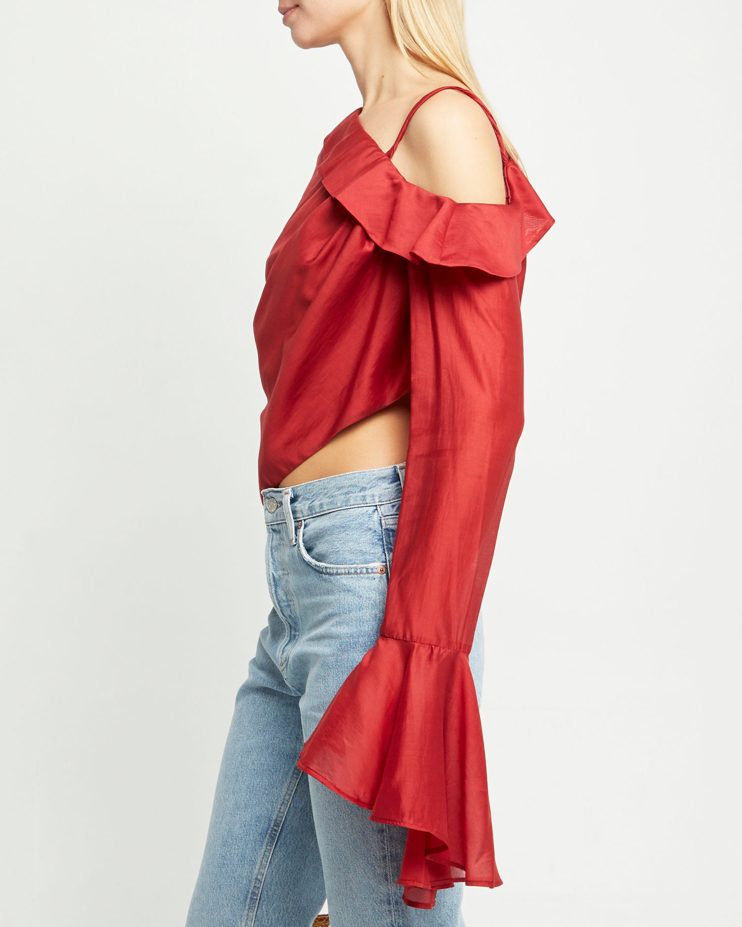 The Adele Top boasts an asymmetric design and off-the-shoulder silhouette, accentuated by delicate ruffle details and long sleeves. In a rich maroon hue, this unique top exudes sophistication and style.