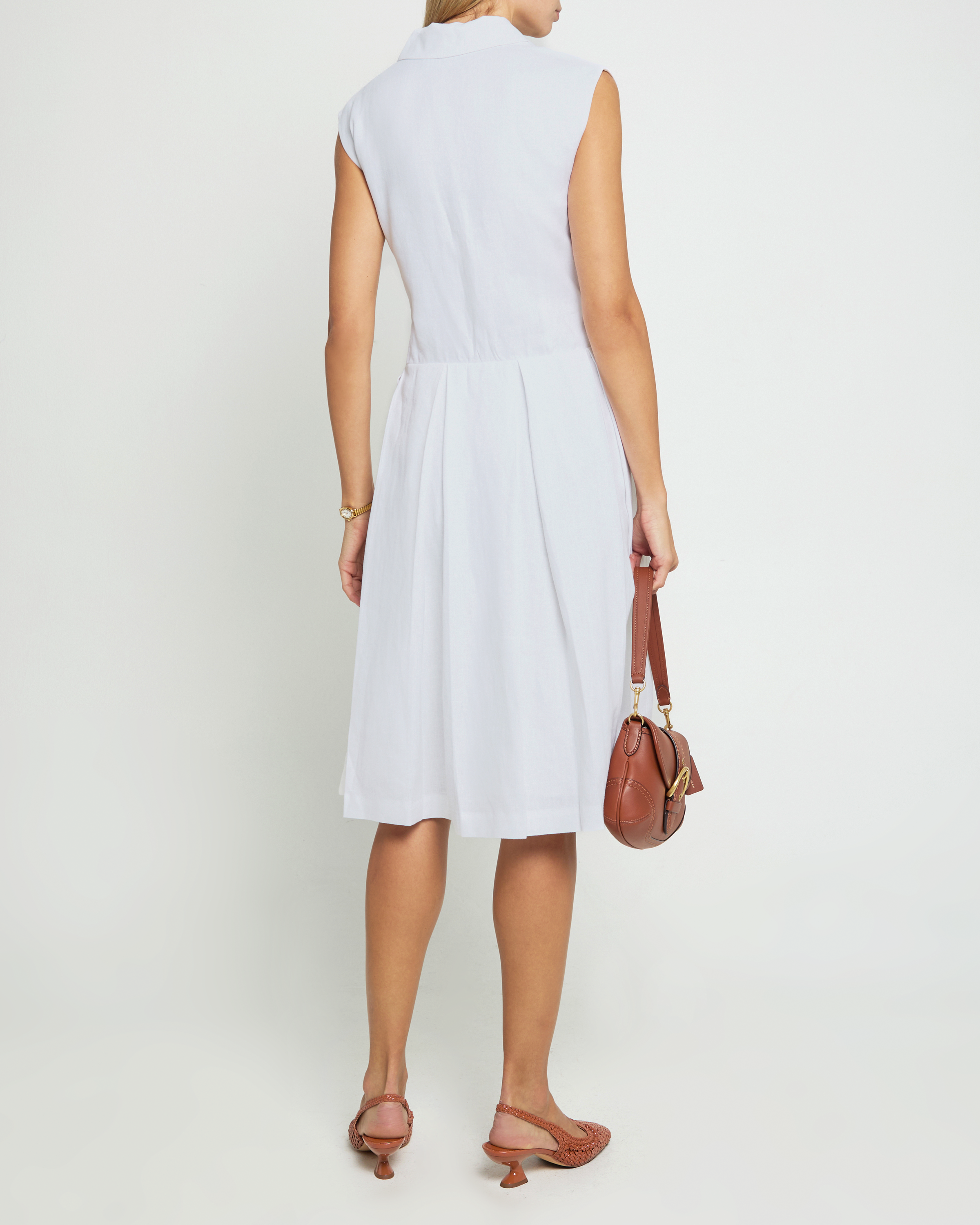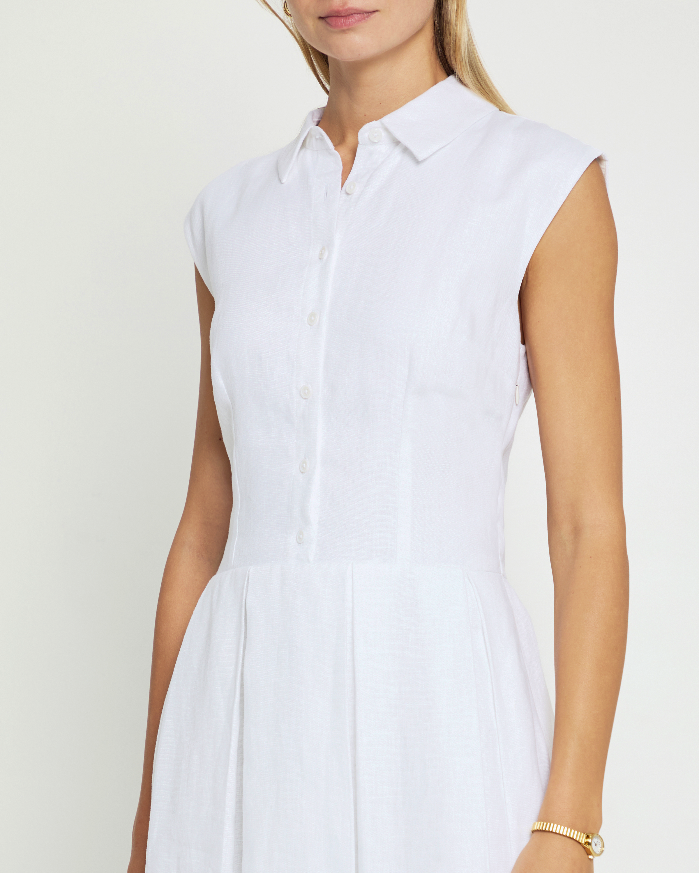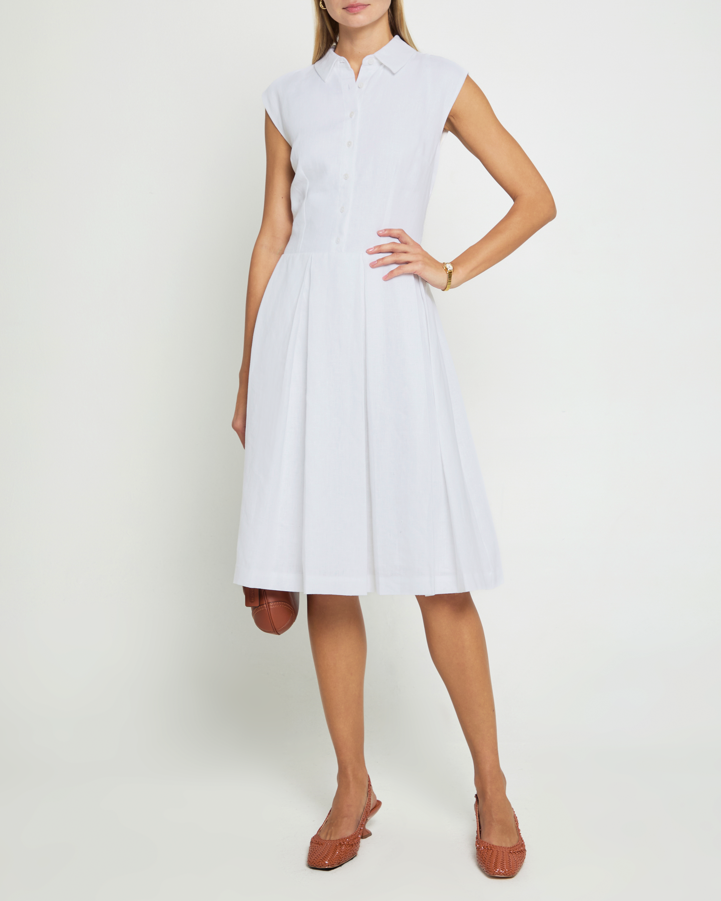 Expertly crafted from crisp, preppy white linen, the Angelika Dress exudes classic elegance. Its collared design and pleated midi skirt add a touch of sophistication. Perfect for any occasion, this dress is a must-have for those seeking timeless style.