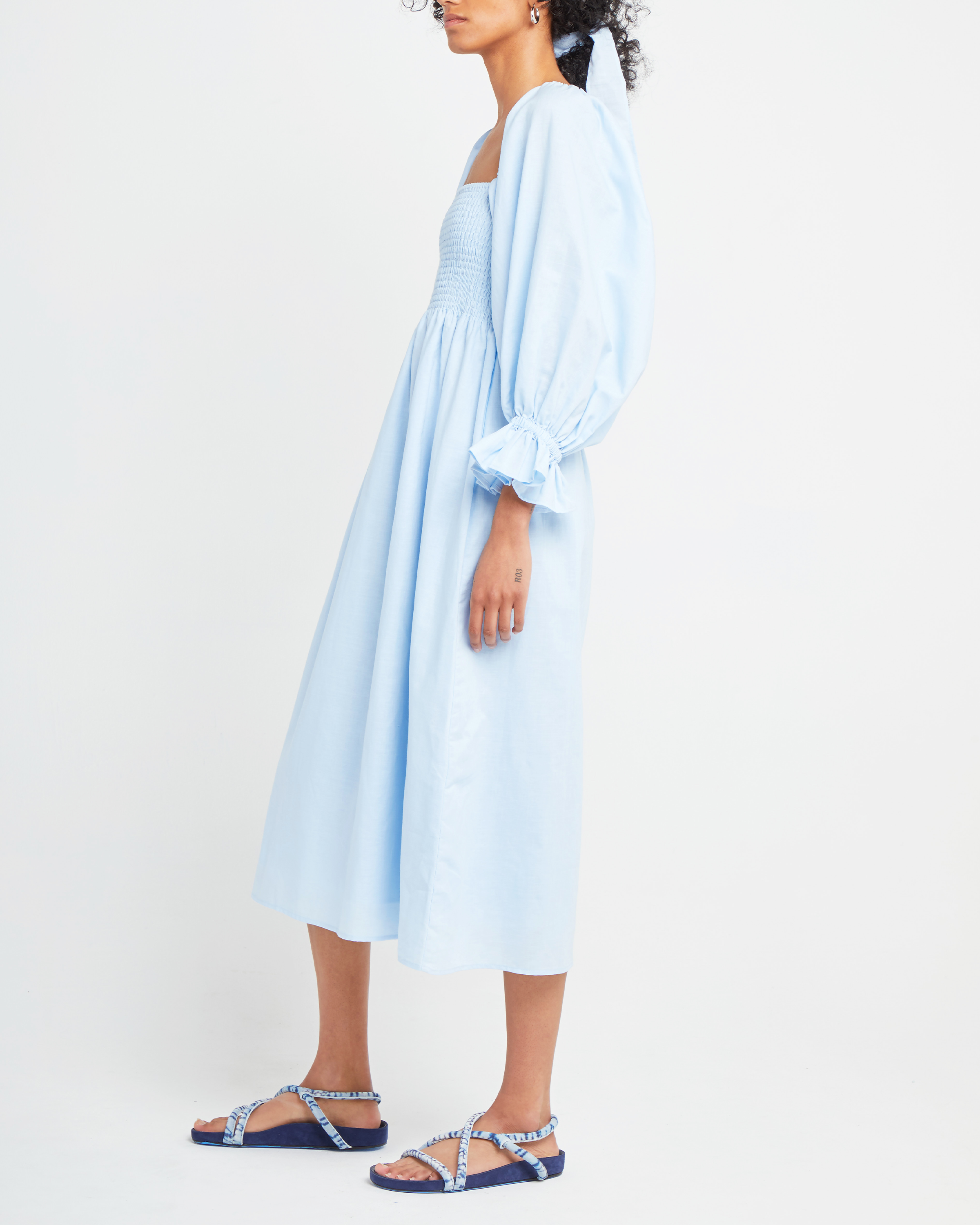 • Sixth image of Athena Dress, a blue midi dress, off shoulder, long sleeve, puff sleeves, smocked