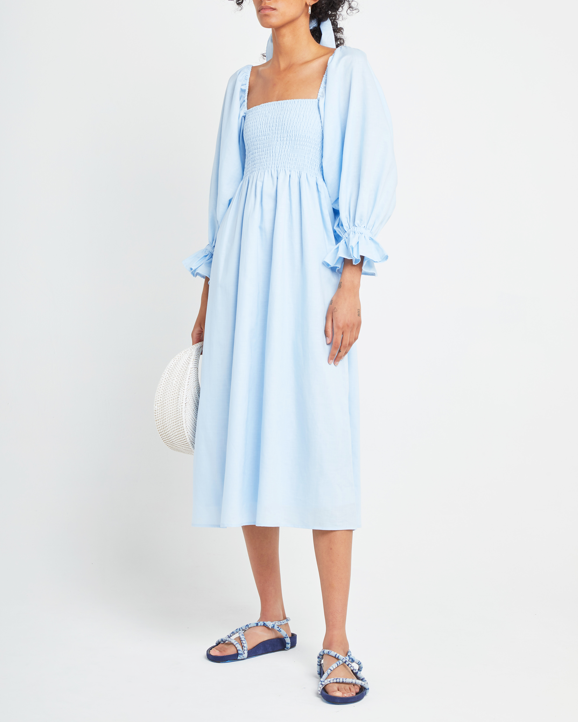 We love the ethereal silhouette of this breezy linen blend dress. Done with exaggerated puff sleeves and a smocked bodice.