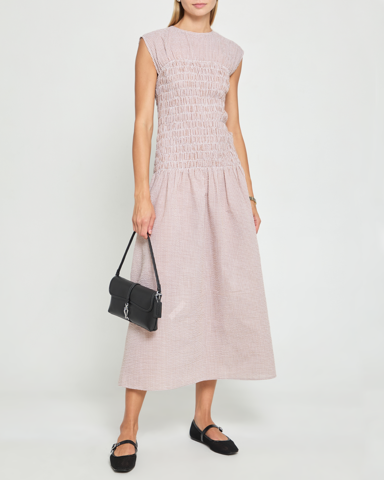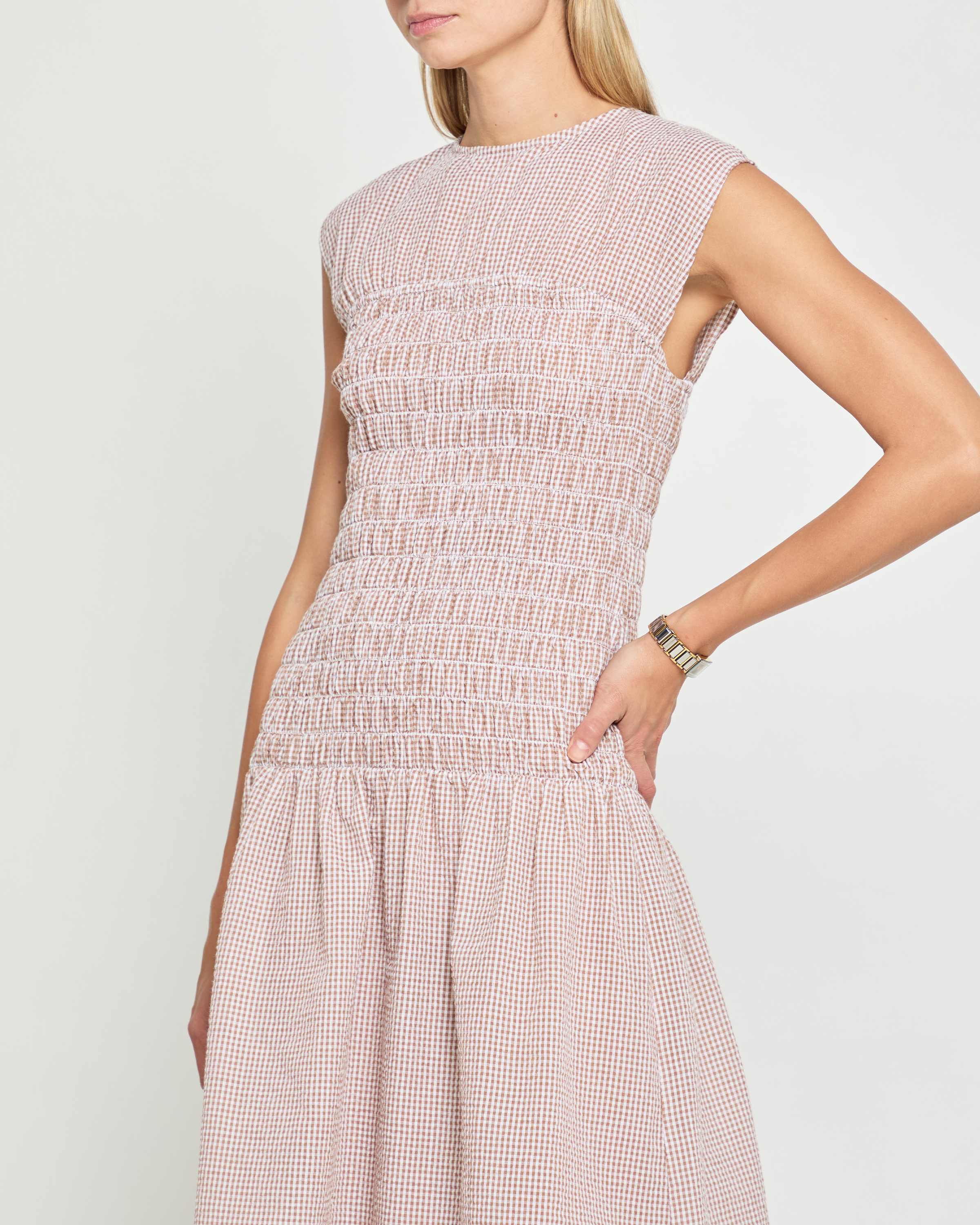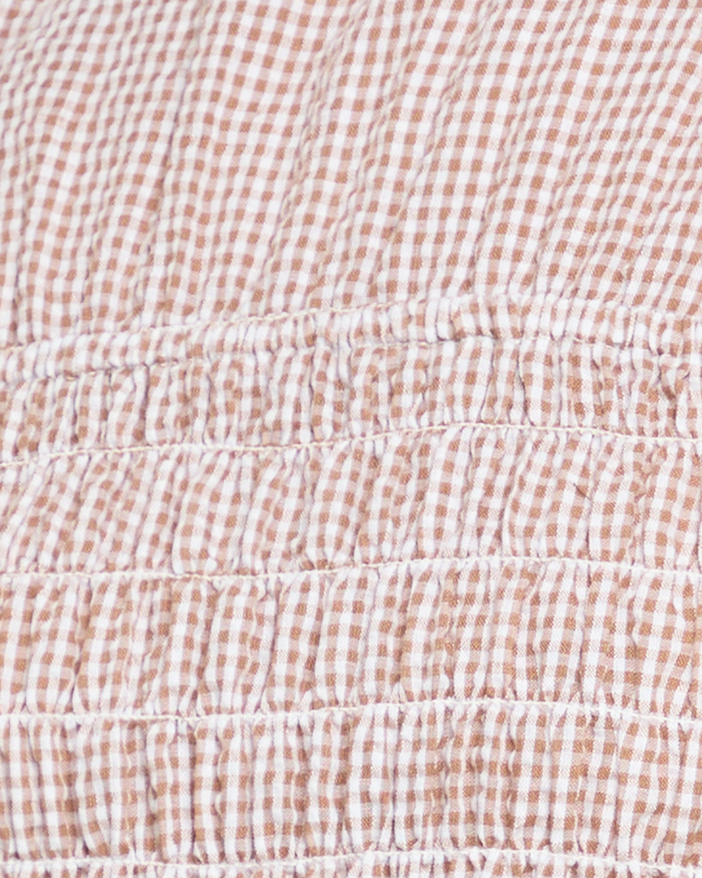The Byrdie Dress features a charming super sweet light brown gingham pattern, made from light and airy fabric for maximum comfort. Its smocked bodice and drop waist provide a flattering fit, while the sophisticated high neckline adds an element of elegance.