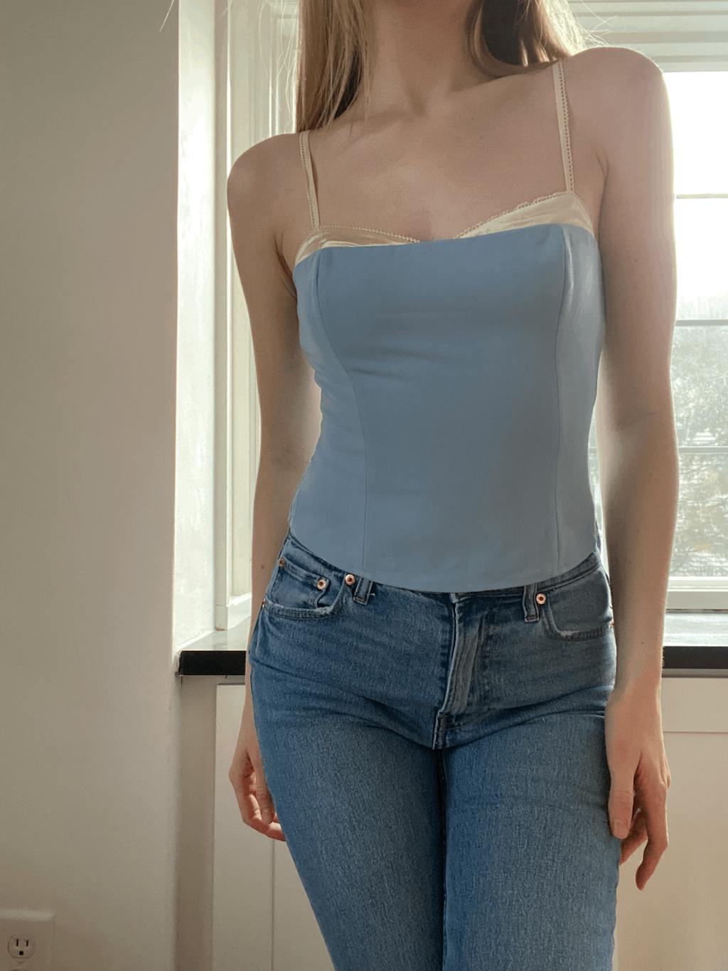 I love the beautiful blue color of this tank top and the structure of the piece is very well done! Also, it is a very comfortable top with he stretch panel in the back.