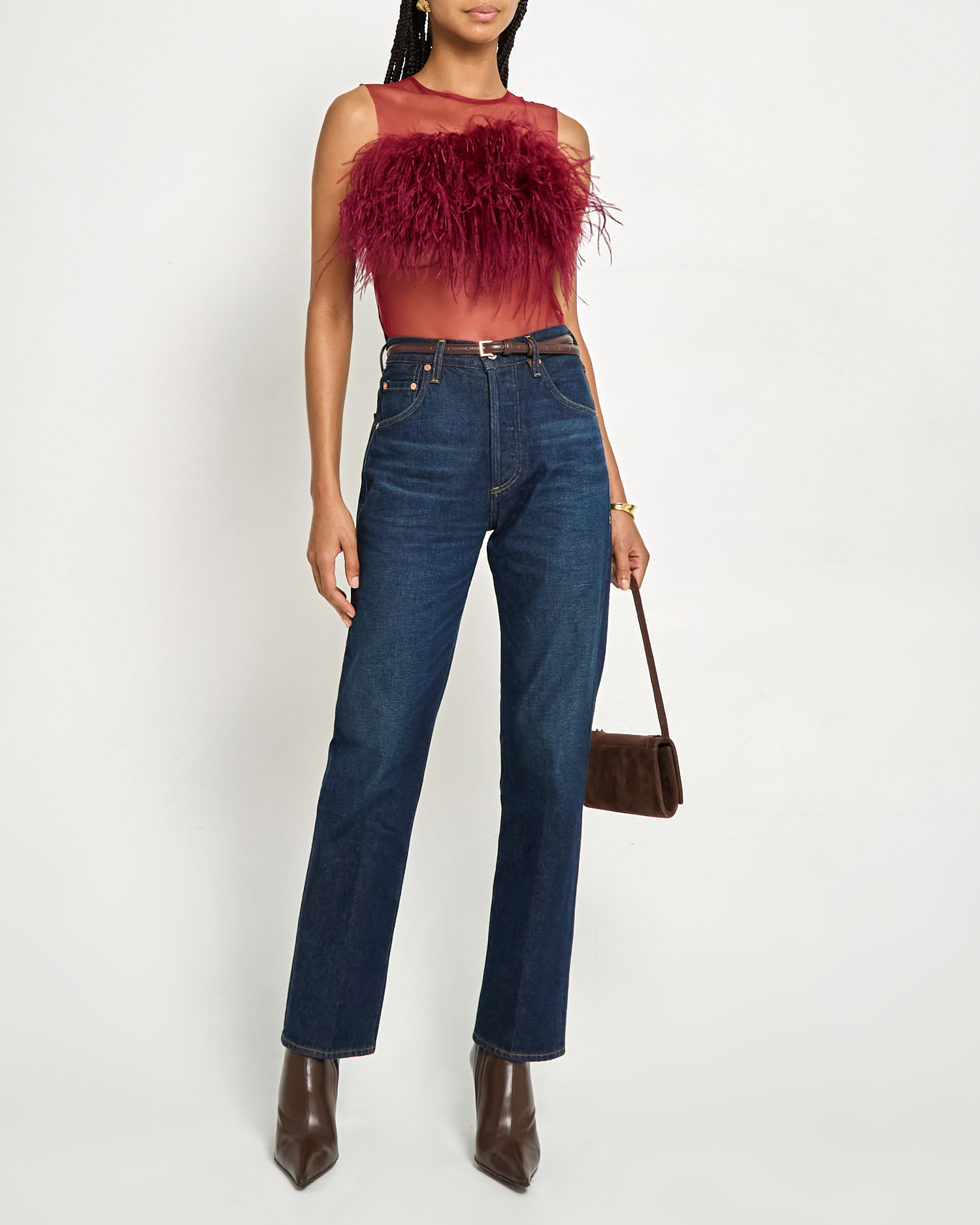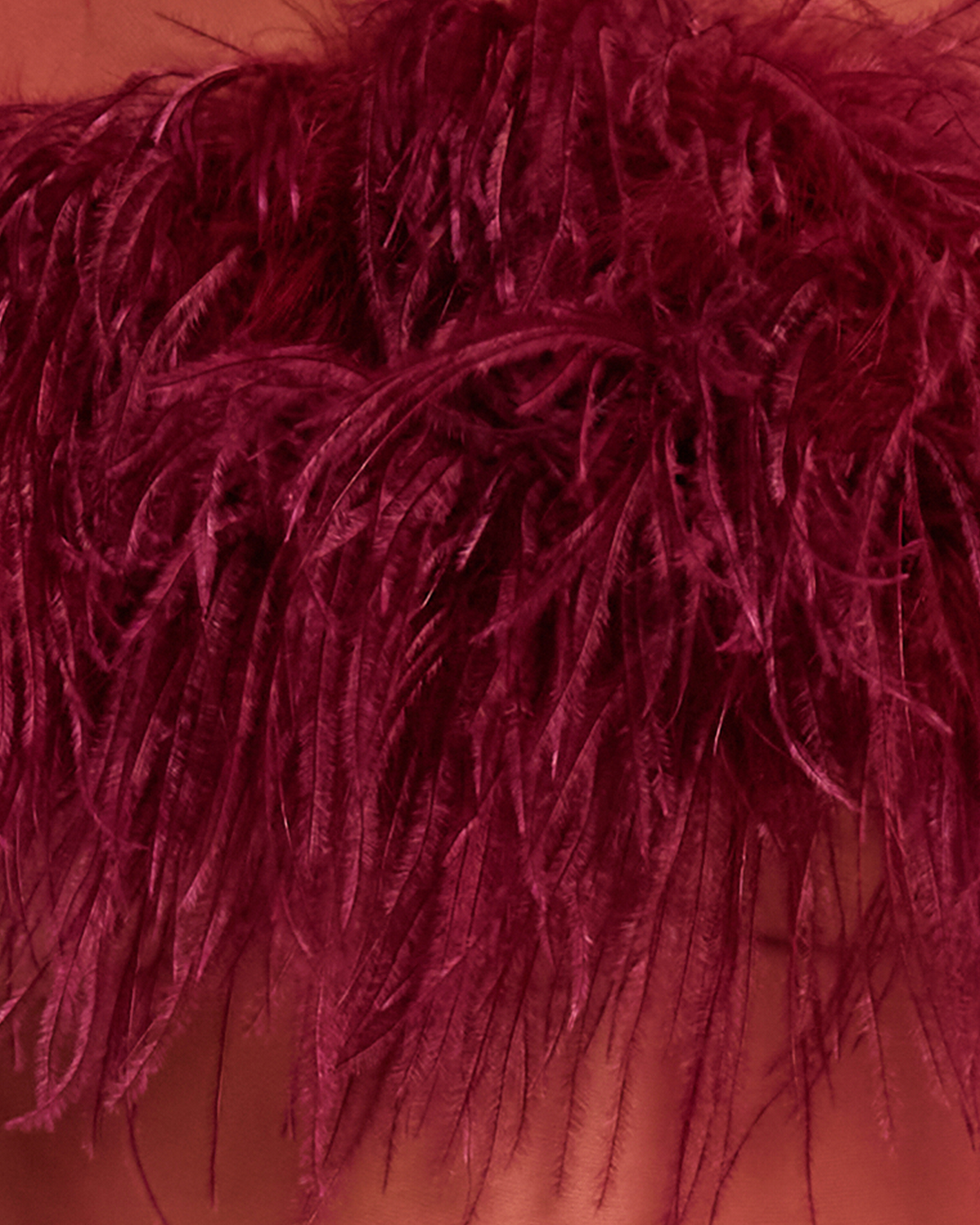 Stand out in this stunning, feathered top. Done in effortlessly elegant burgundy with a chic, mesh bodice.