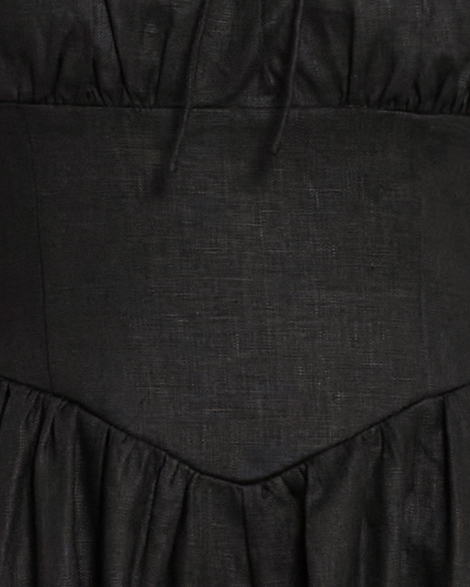 Elevate your wardrobe with the Chiara Linen Dress. Designed with a fitted waist and gathered bust for a flattering silhouette, its charming bow detail adds a touch of femininity. Made of breathable linen, this dress combines style and comfort effortlessly.