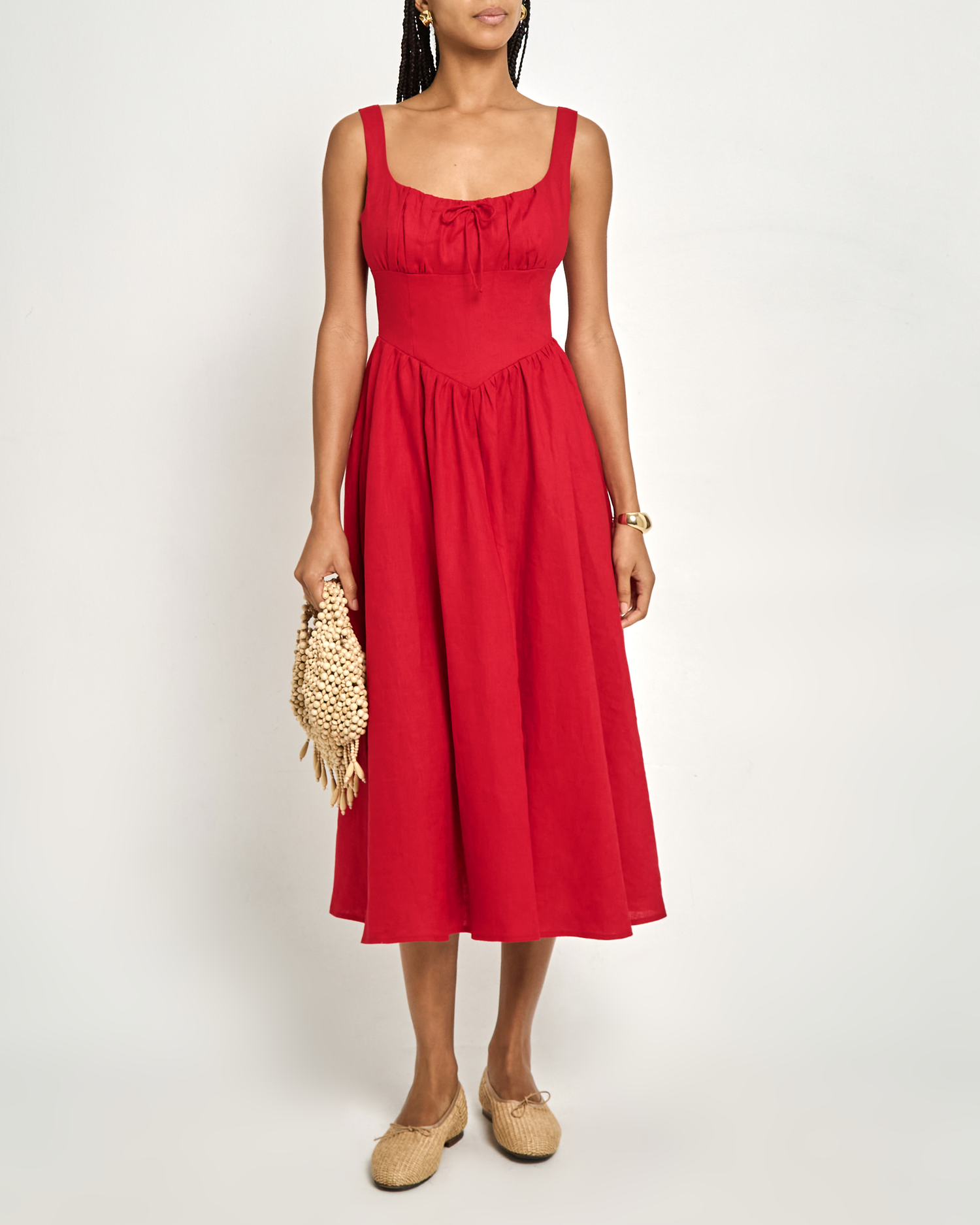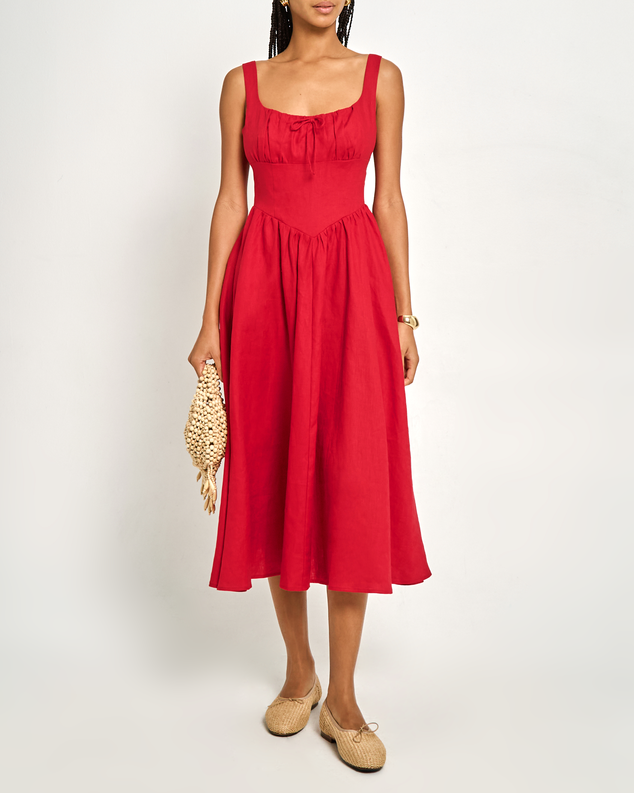 Elevate your wardrobe with the Chiara Linen Dress. Designed with a fitted waist and gathered bust for a flattering silhouette, its charming bow detail adds a touch of femininity. Made of breathable linen, this dress combines style and comfort effortlessly.