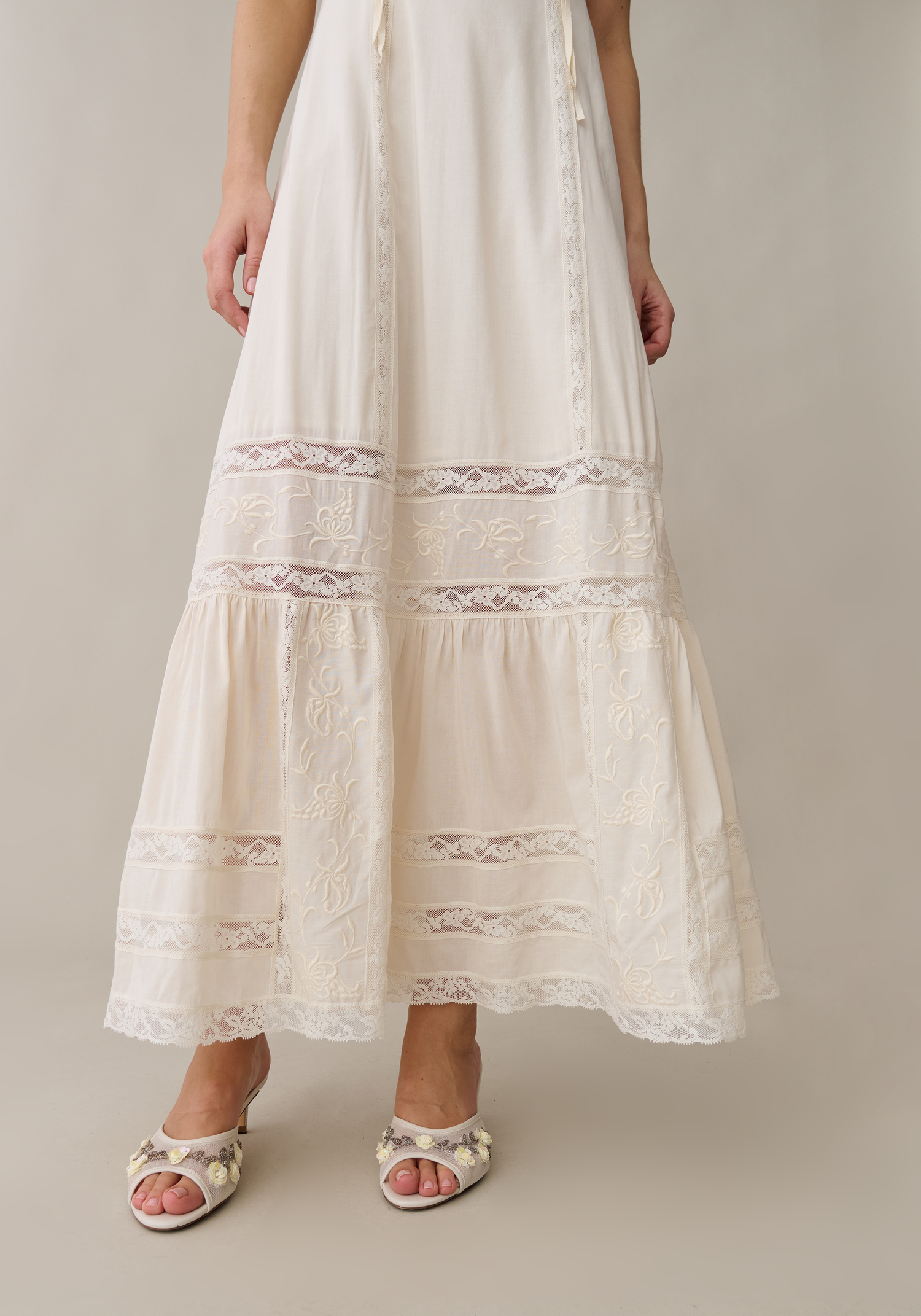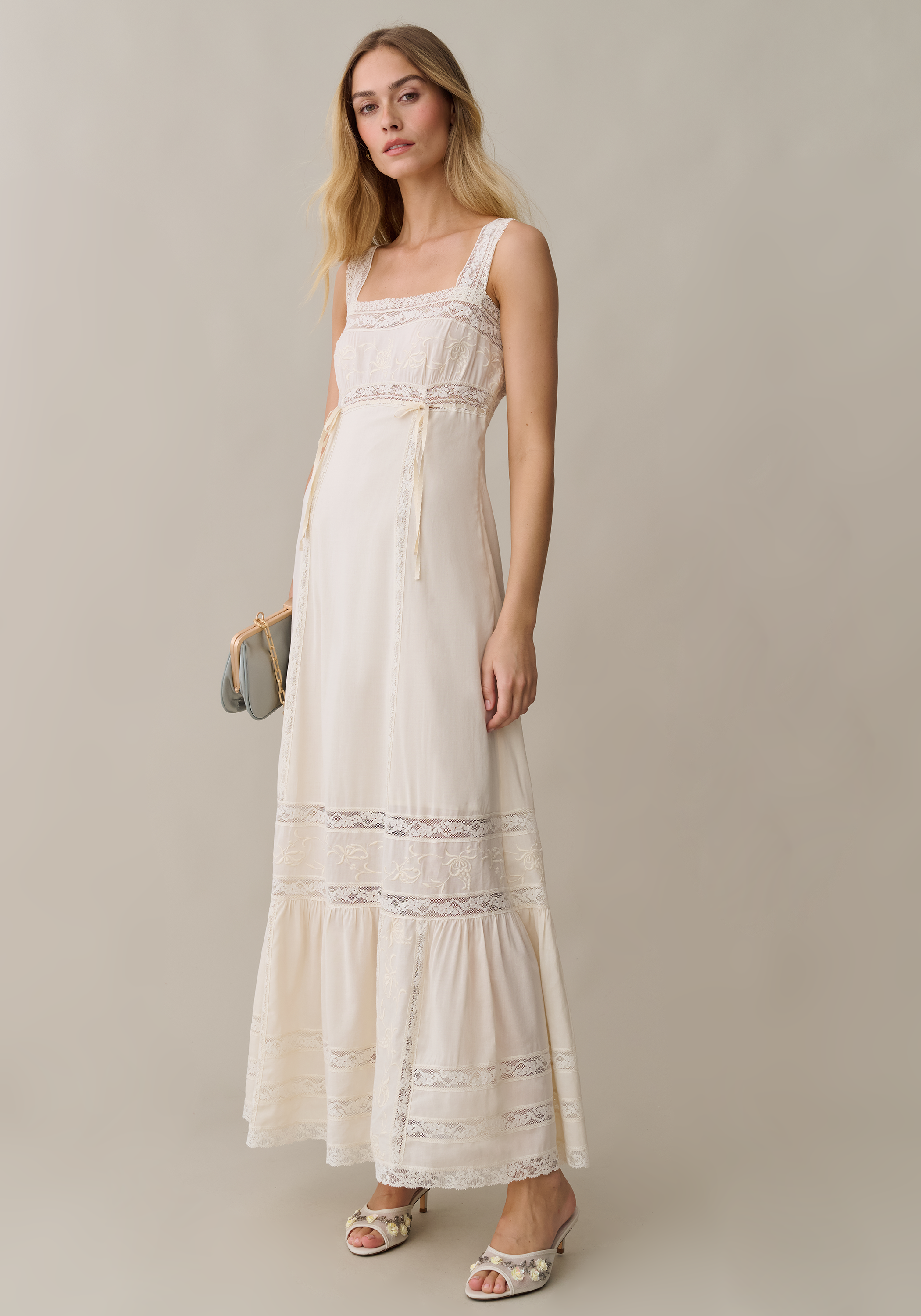 Featuring an elegant square neckline and intricate lace-trimmed straps, this maxi dress is defined by its beautiful mix of tonal embroidery and sheer lace paneling. The empire waist with delicate tie details flows into a tiered, floor-length skirt, creating a soft and dreamy silhouette that is both sophisticated and effortlessly charming.