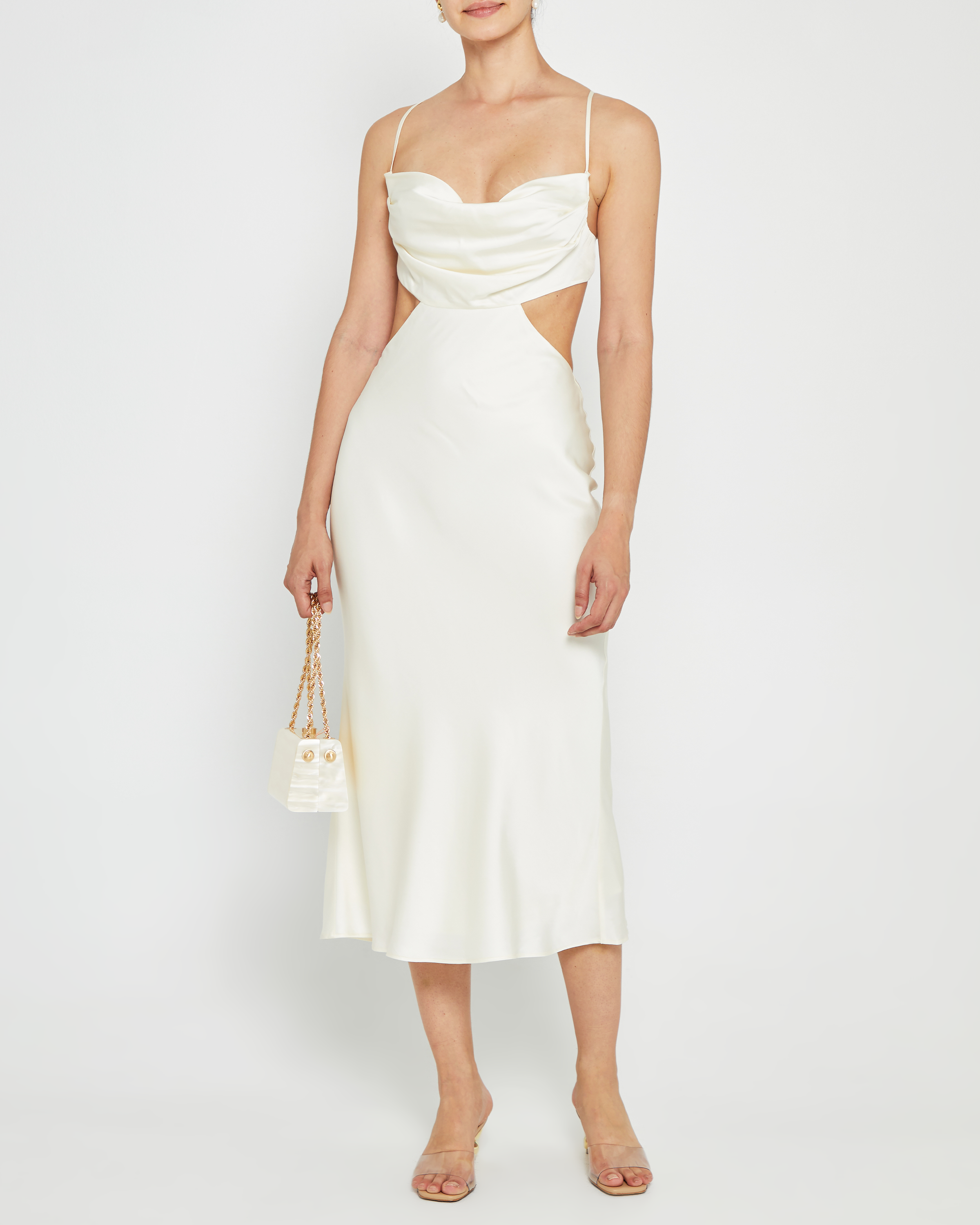 The Gilda Dress offers a classic look with a modern edge. Crafted from satin with an open-back and a draped neckline, the midi-length dress exudes simple elegance.