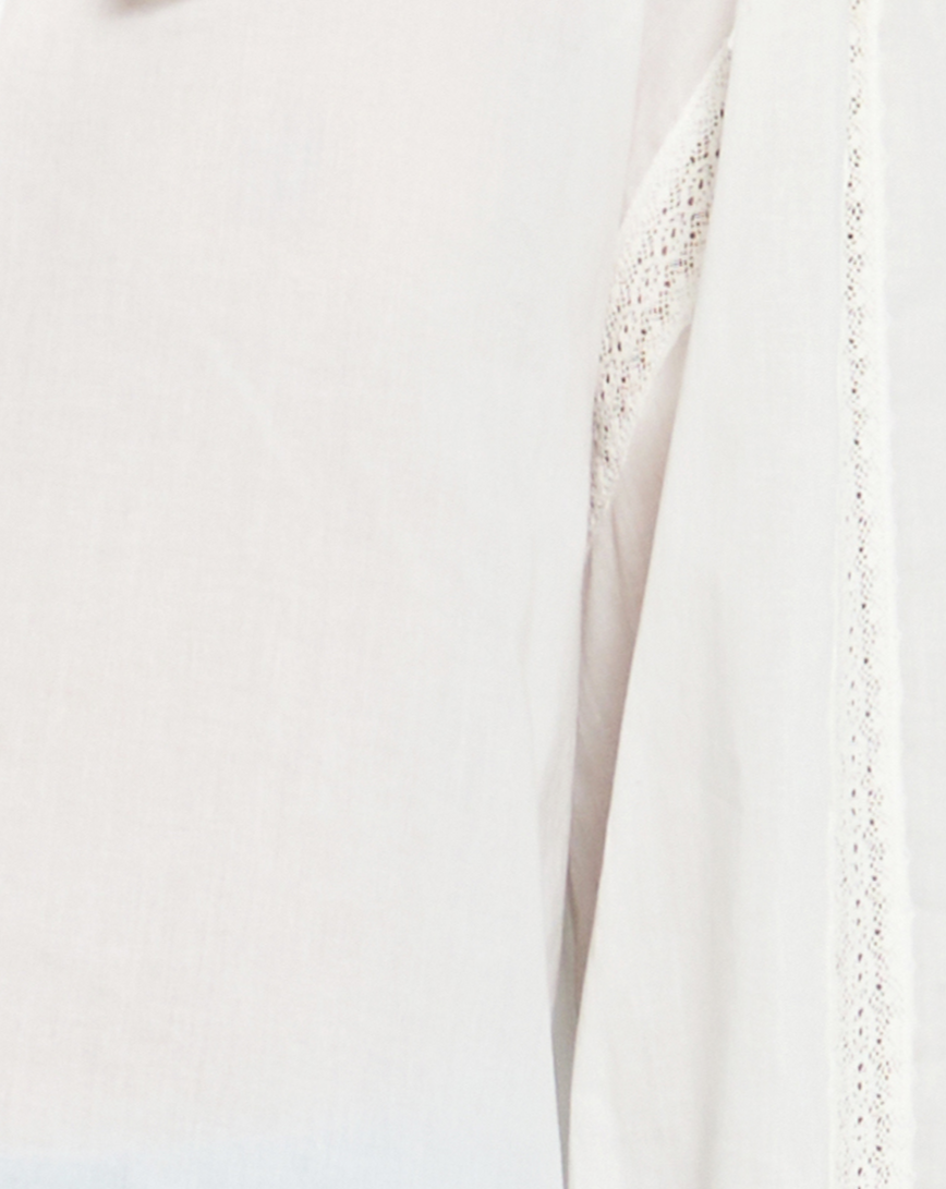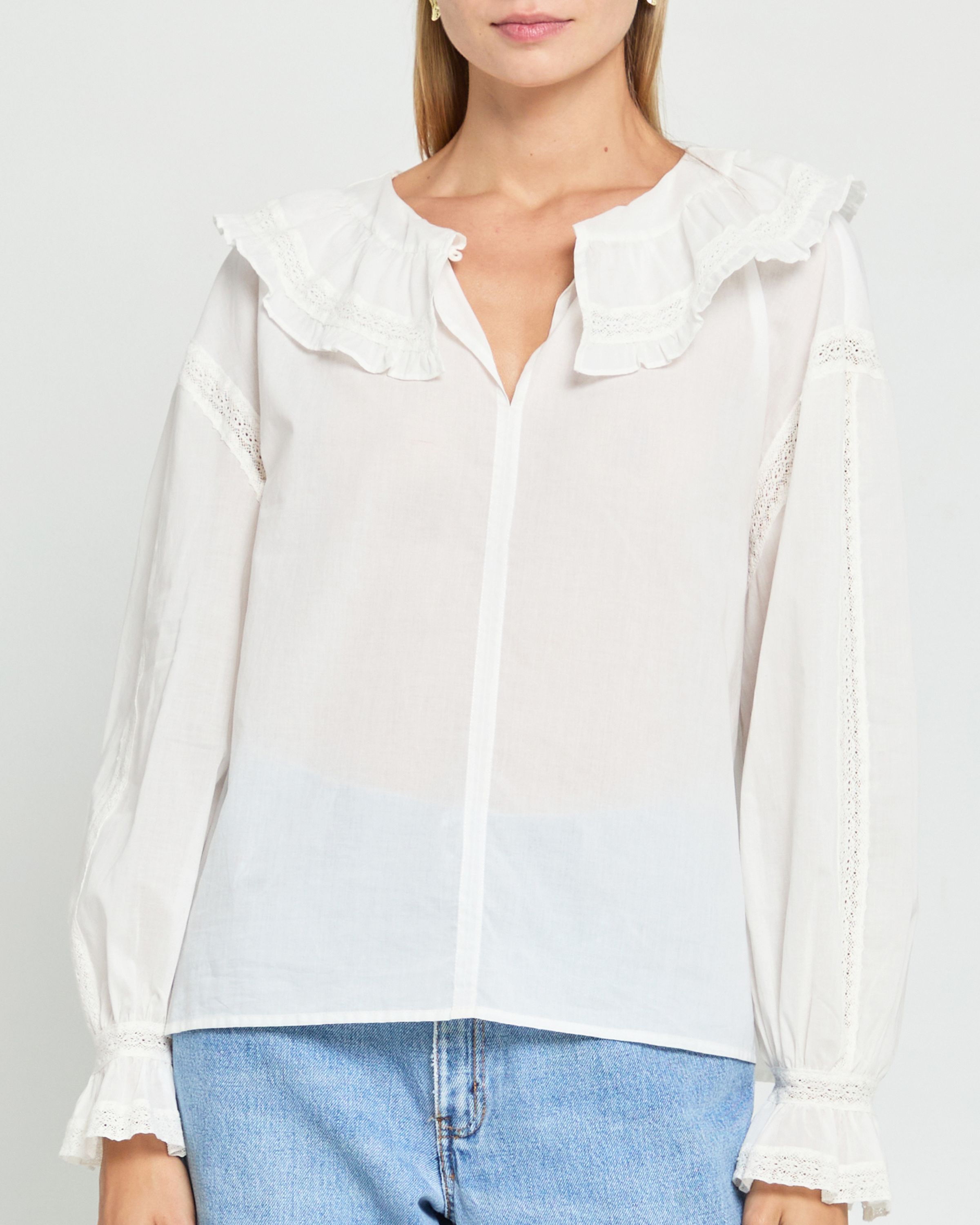 The Kalliope Top features a peasant sleeve with a delicate ruffle and a ruffled collar accented with lace detailing. The front button at the neck allows for versatile styling options, while the breezy fabric ensures comfort. Elevate your wardrobe with this feminine and versatile top.