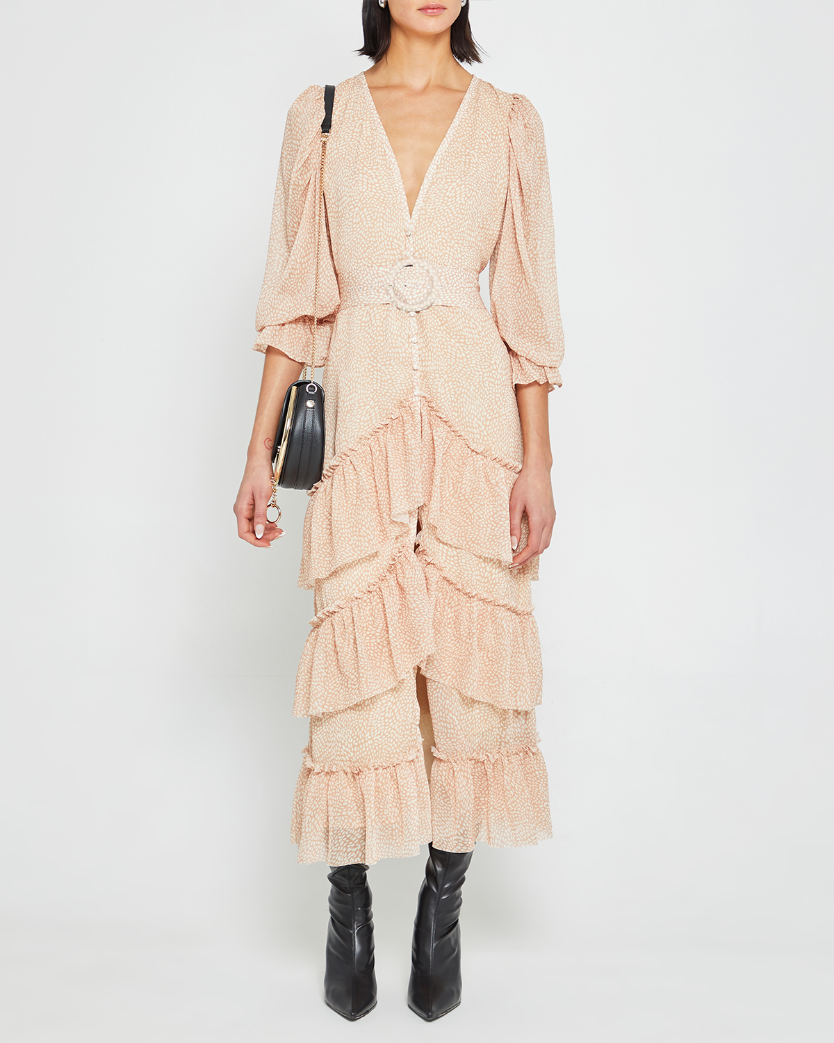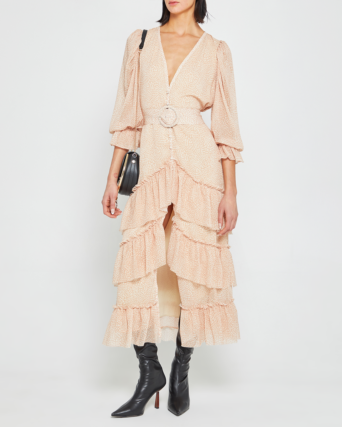 Layers of silky material create this bright and floaty dress. Finished with ruffled details and a matching belt.