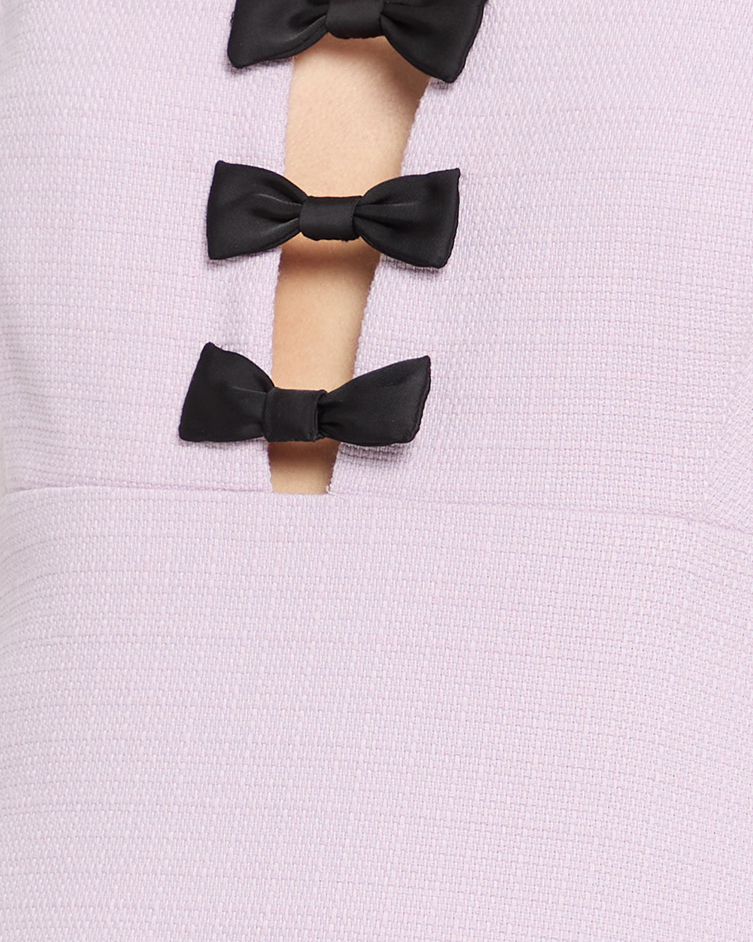 Introducing the Kori Dress - a chic and stylish addition to your wardrobe. Made from a structured tweed-textured material, this lovely lilac dress features cut-outs at the bust adorned with adorable contrasting black bows.