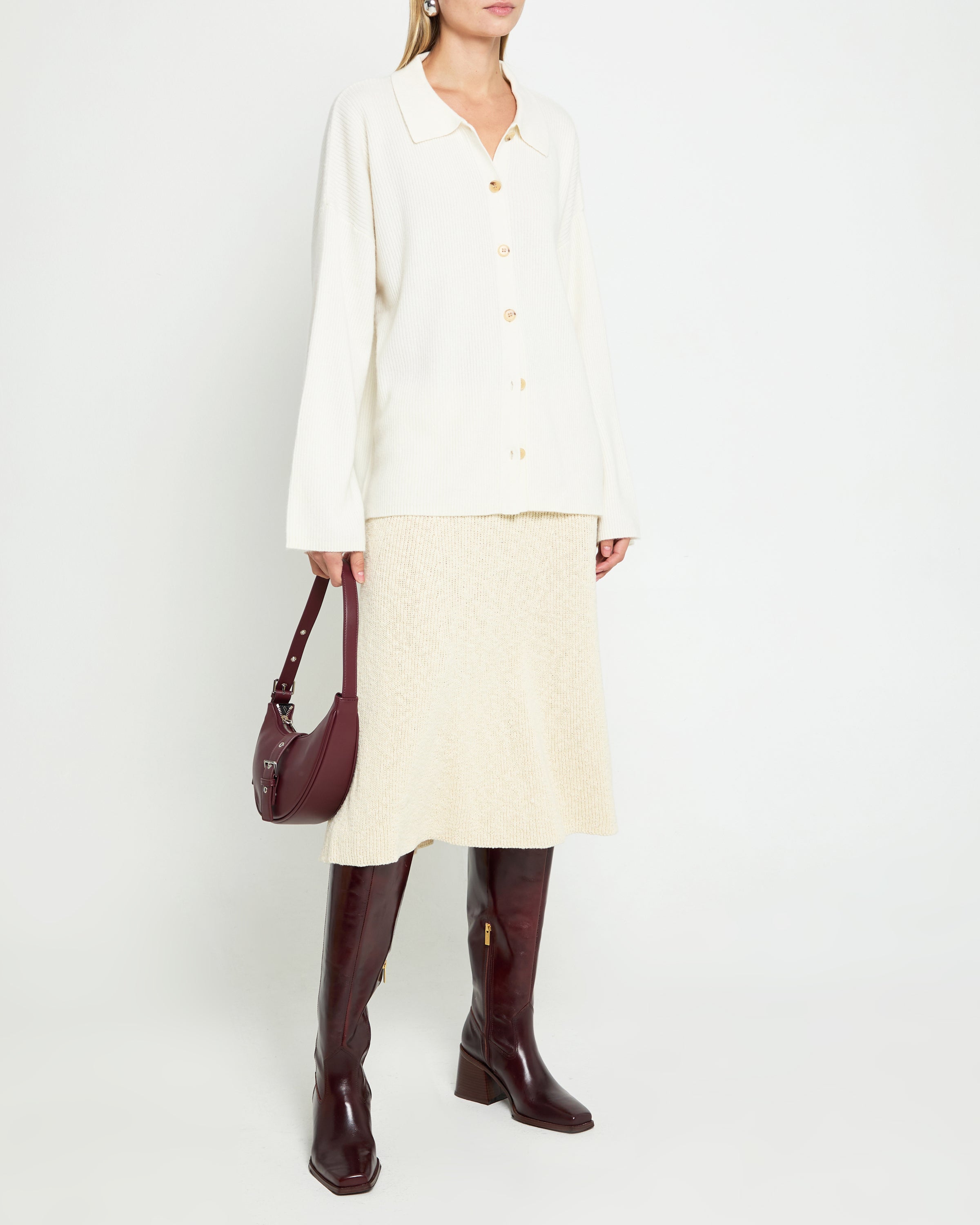 The Madelyn Skirt is a unique and elevated piece, perfect for adding sophistication and versatility to any wardrobe. Its textured and thick fabric provides a cool and comfortable fit, while its midi-length design makes it suitable for a variety of occasions. A must-have for any fashion-forward individual.