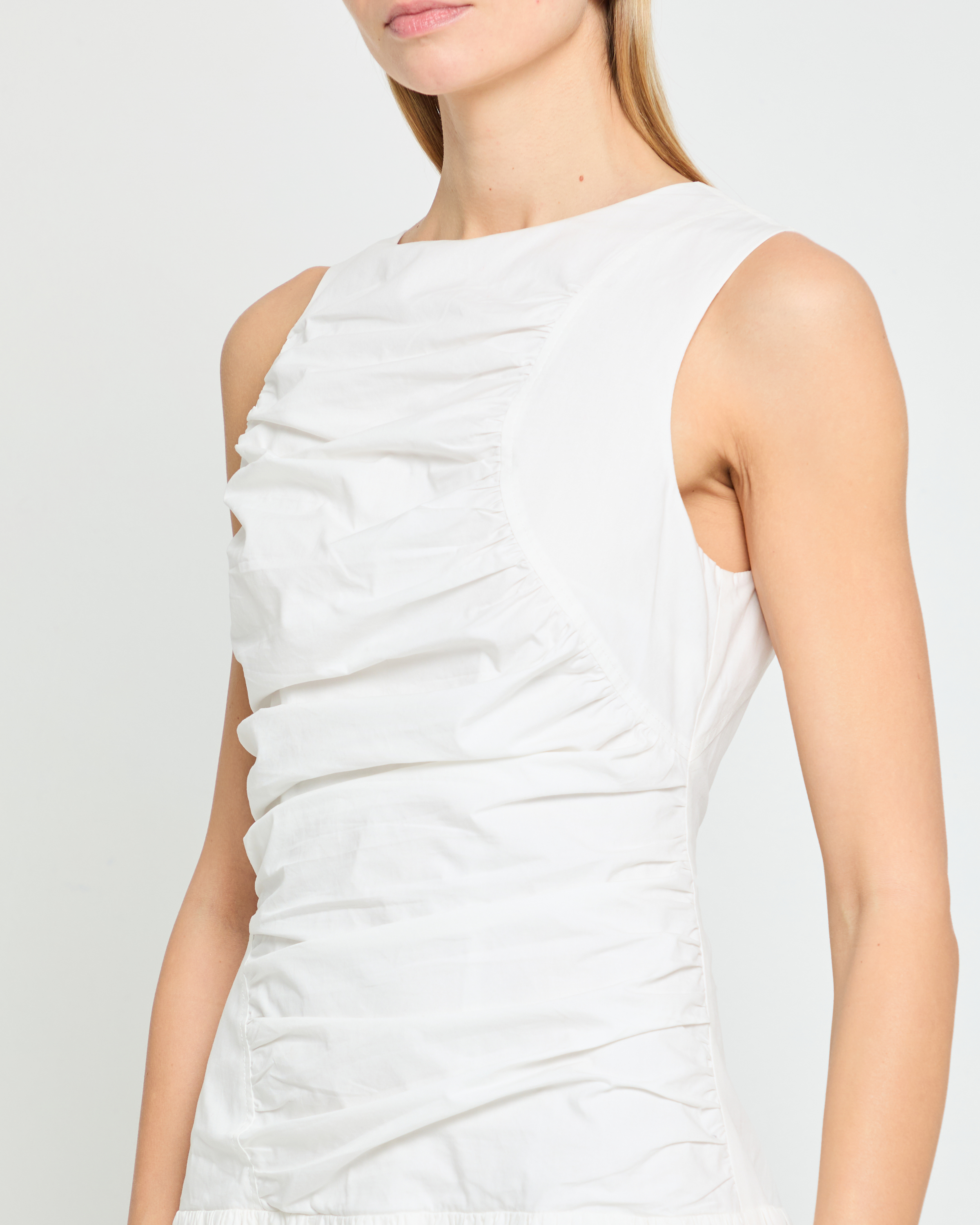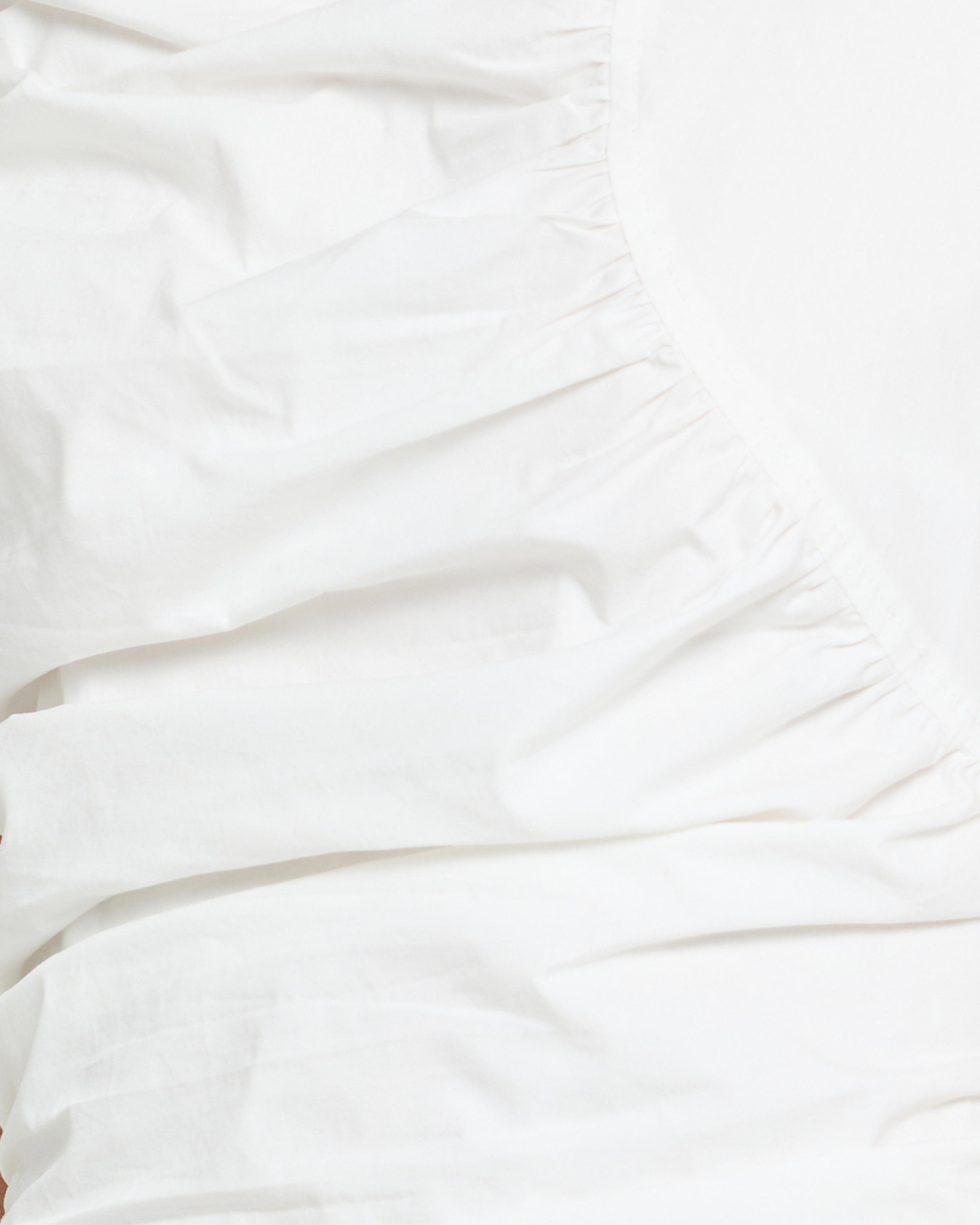 The Mirabelle Cotton Dress is expertly crafted with crisp 100% cotton for a timeless and breathable feel. The high neckline and drop waist offer a modern touch, while the gathered bodice creates a sculptural and flattering look. With its versatile design, this dress is perfect for any occasion.
