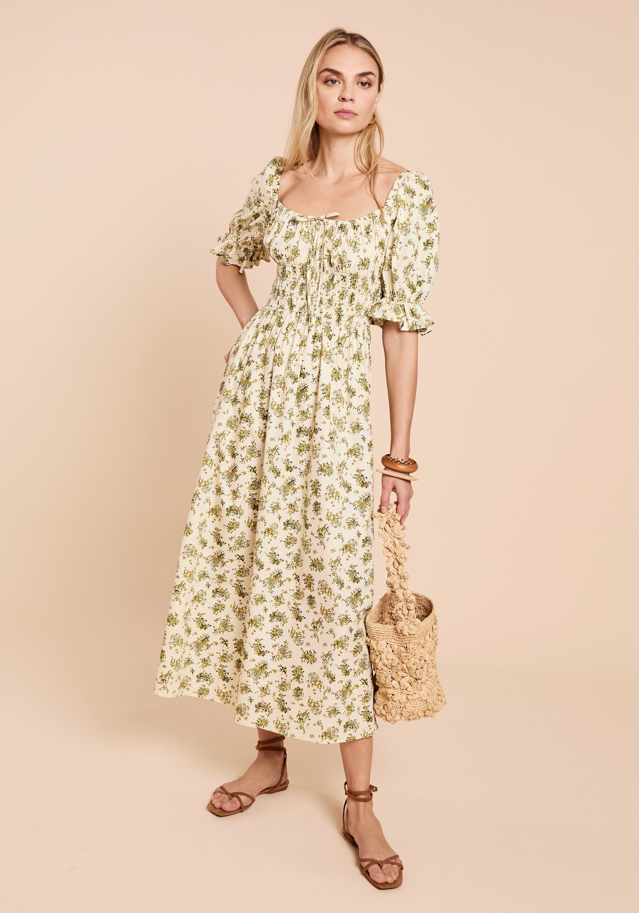 The Mireya Cotton Dress combines a comfortable smocked bodice with romantic sleeves for an effortlessly elegant silhouette. Ruffle accents add subtle texture, while the scoop neckline enhances its timeless appeal. Made from breathable cotton, this dress offers both style and comfort for everyday sophistication.