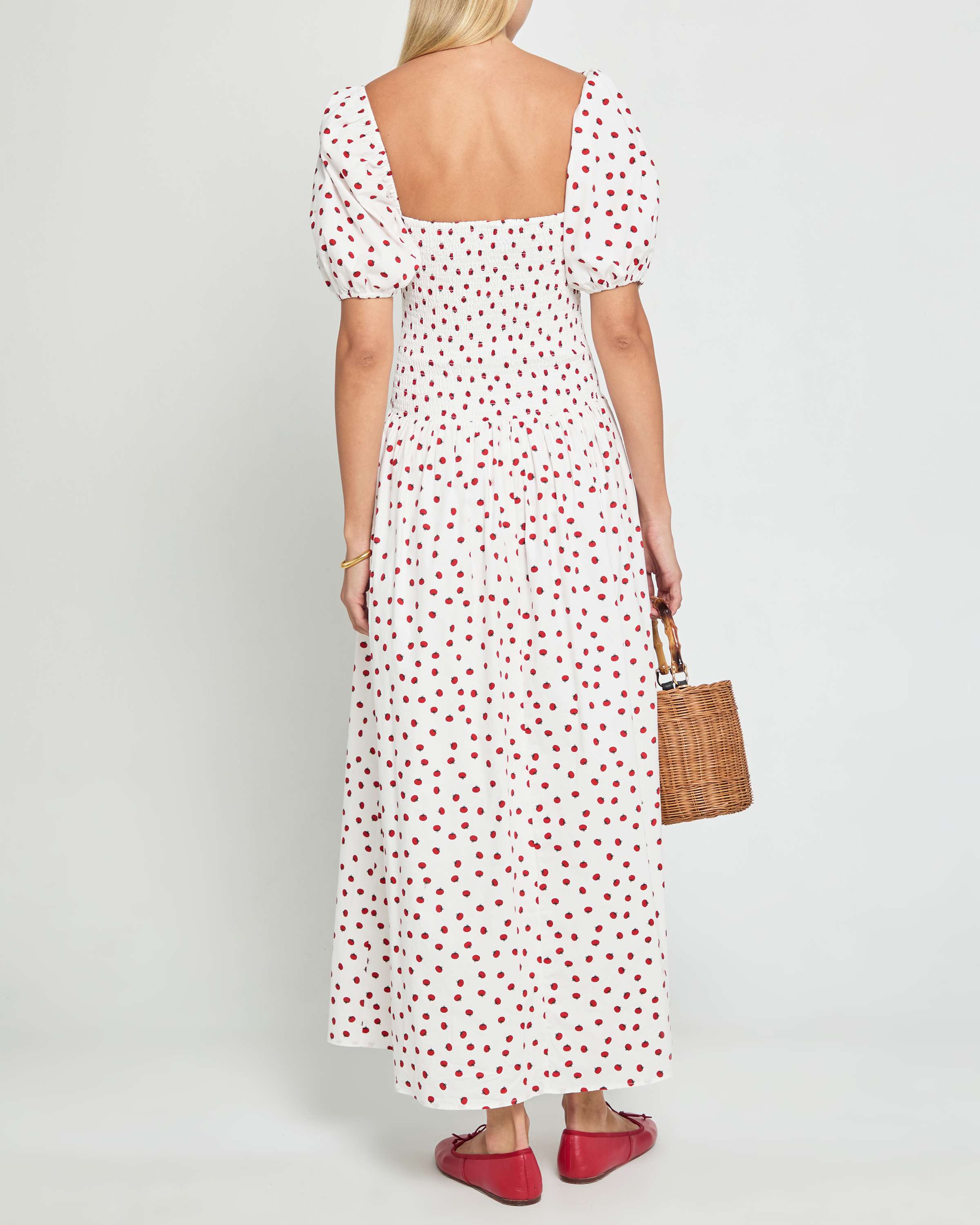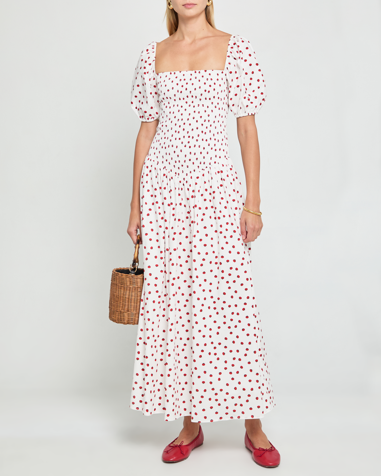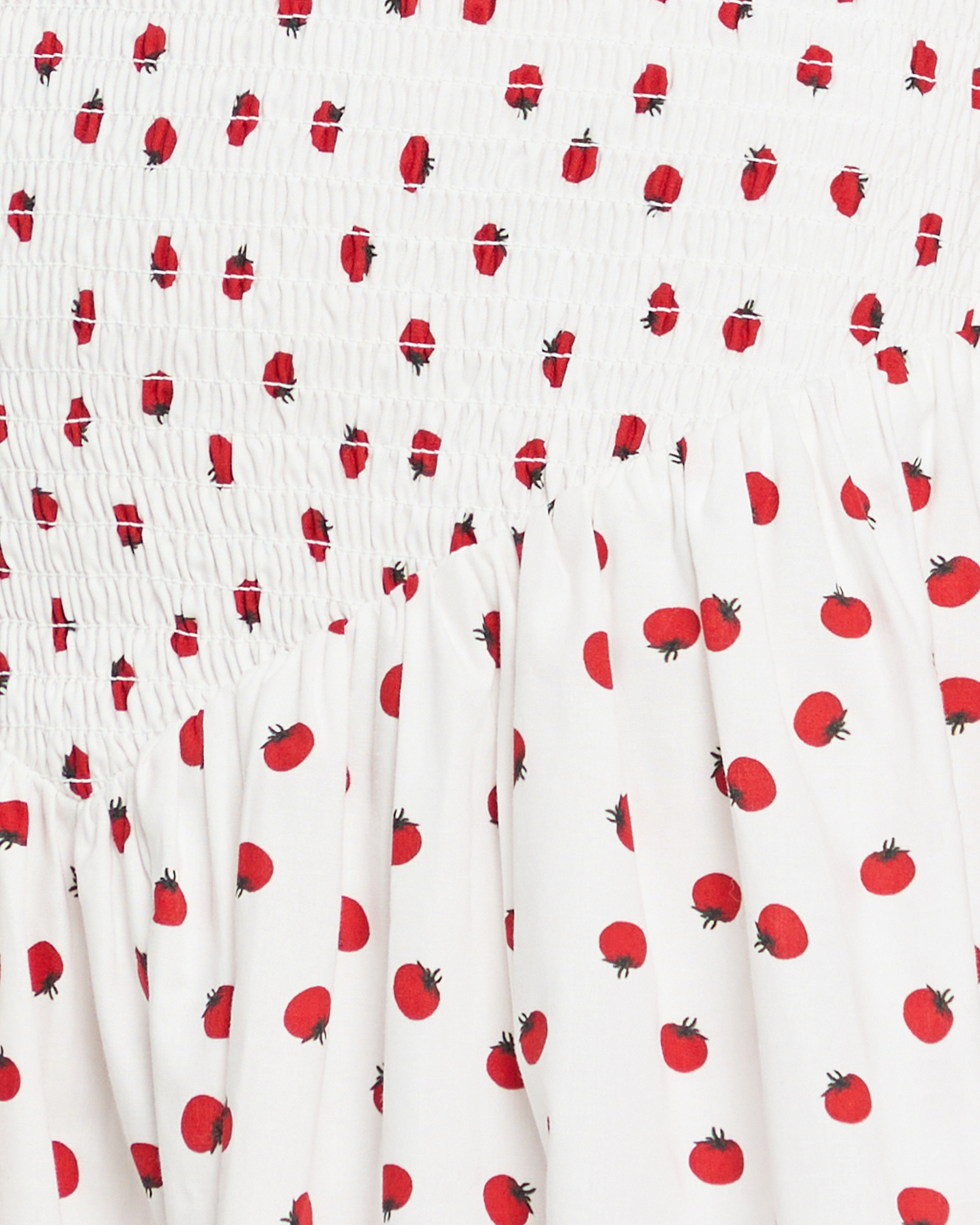 This Nan Maxi Dress features a playful tomato print, complemented by a V-shaped drop waist and puff sleeves. Its comfortable smocking ensures a perfect fit, while the maxi length adds elegance to any occasion. Enjoy the fresh and fun design of this dress with ease and style.