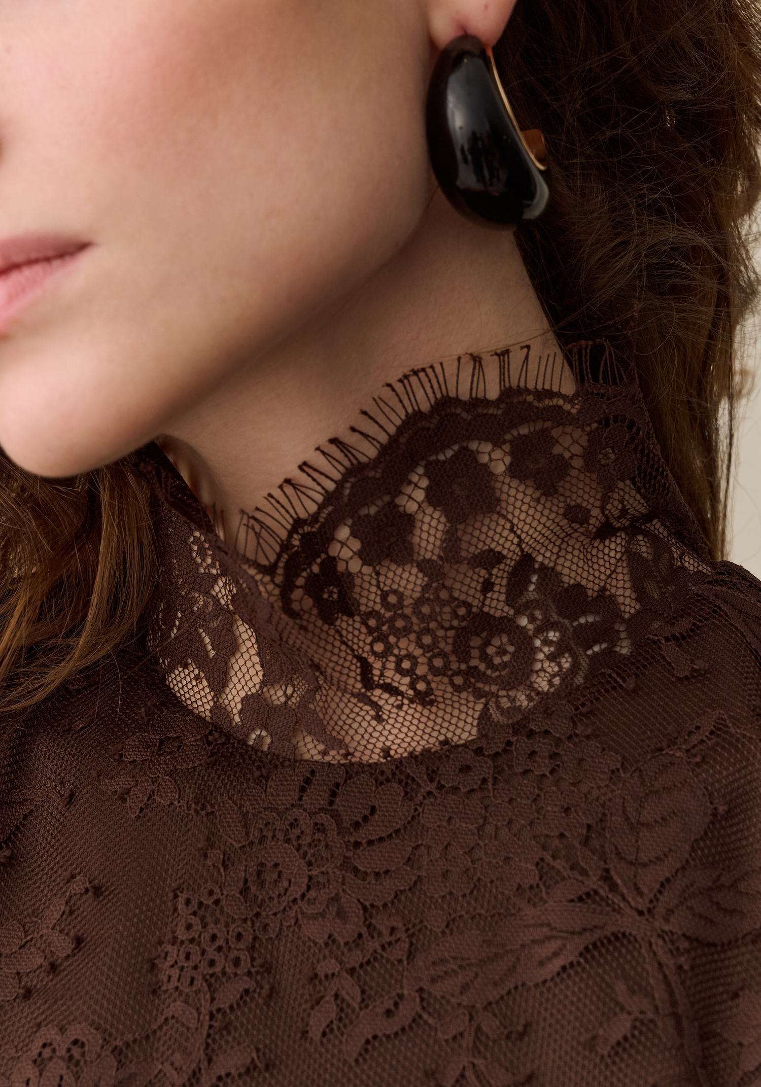 The Nivea Dress showcases rich brown lace in a fun mini length. Done with a chic high neckline and fluttery short sleeves for an elevated feel. Meanwhile, a flattering sash and charming rosette detail at the hips create an elegant, balanced silhouette.