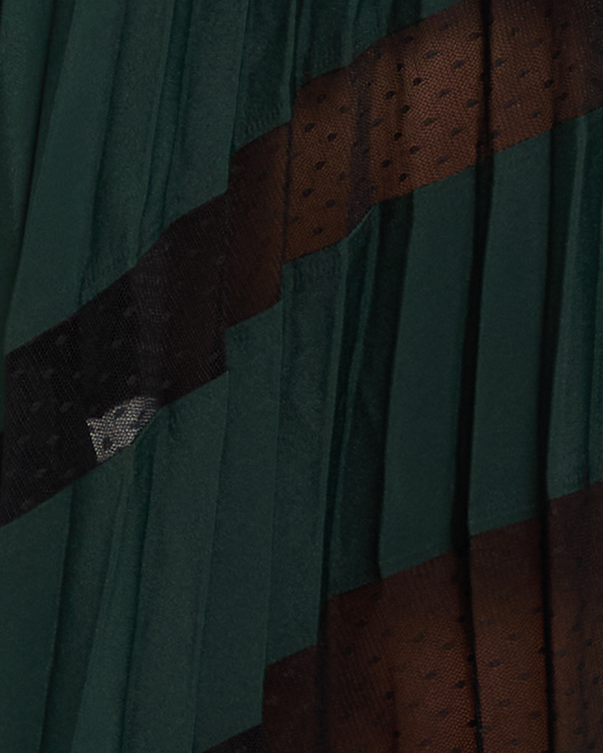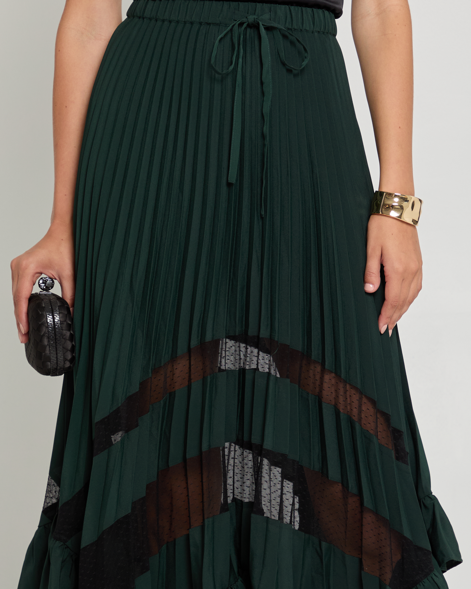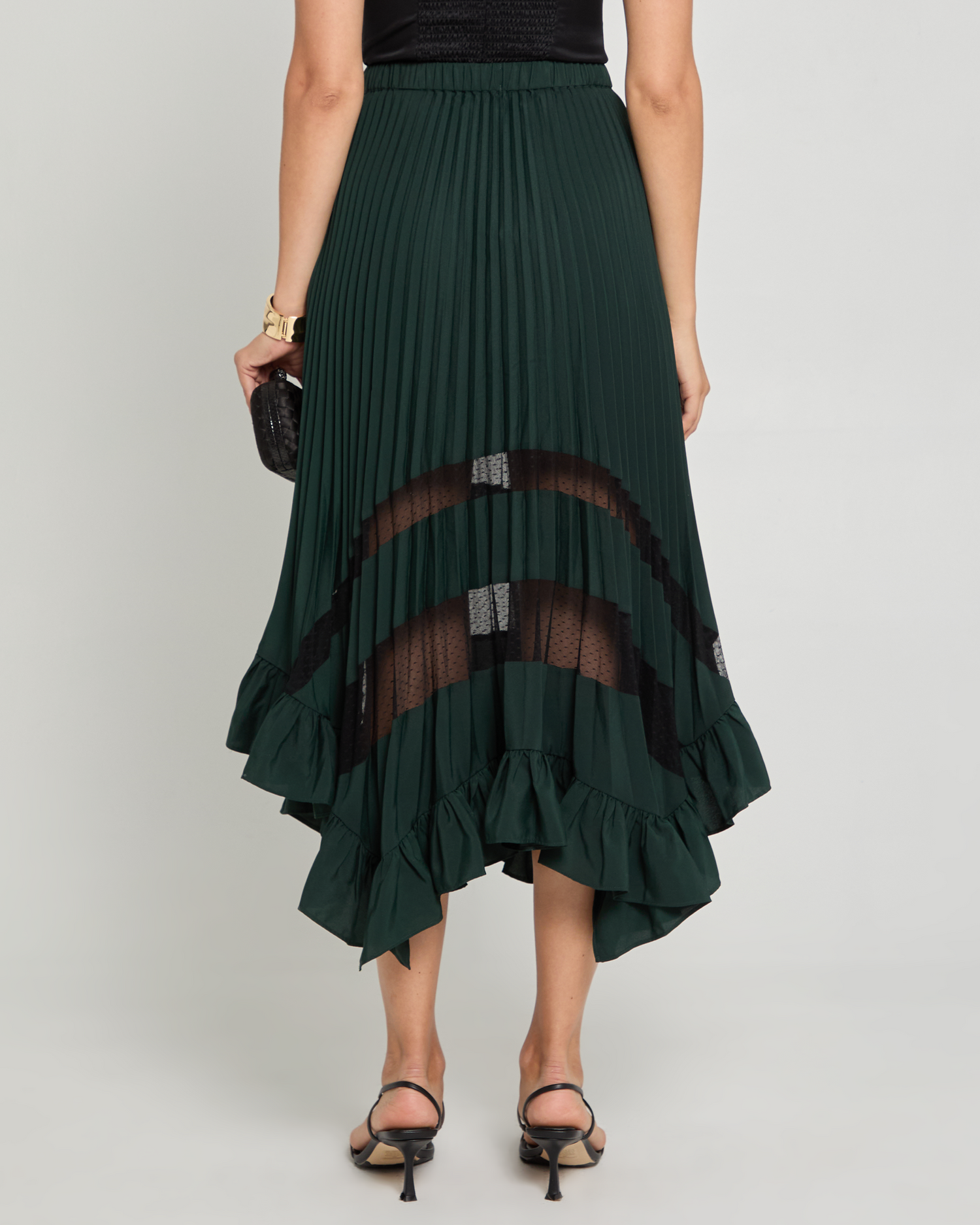 The Rosemary Skirt is the epitome of luxury and elegance with its rich deep green hue and decked in details design. Its asymmetric hem, ruffles, and pleats add dimension, while the sheer lace paneling gives a touch of femininity. A must-have for a stylish and sophisticated look.
