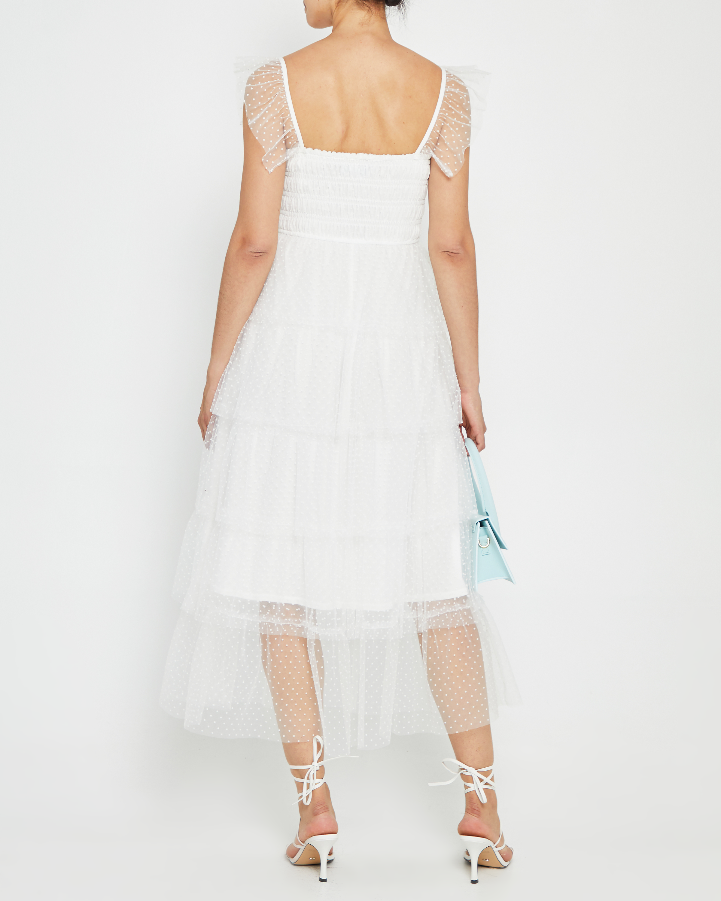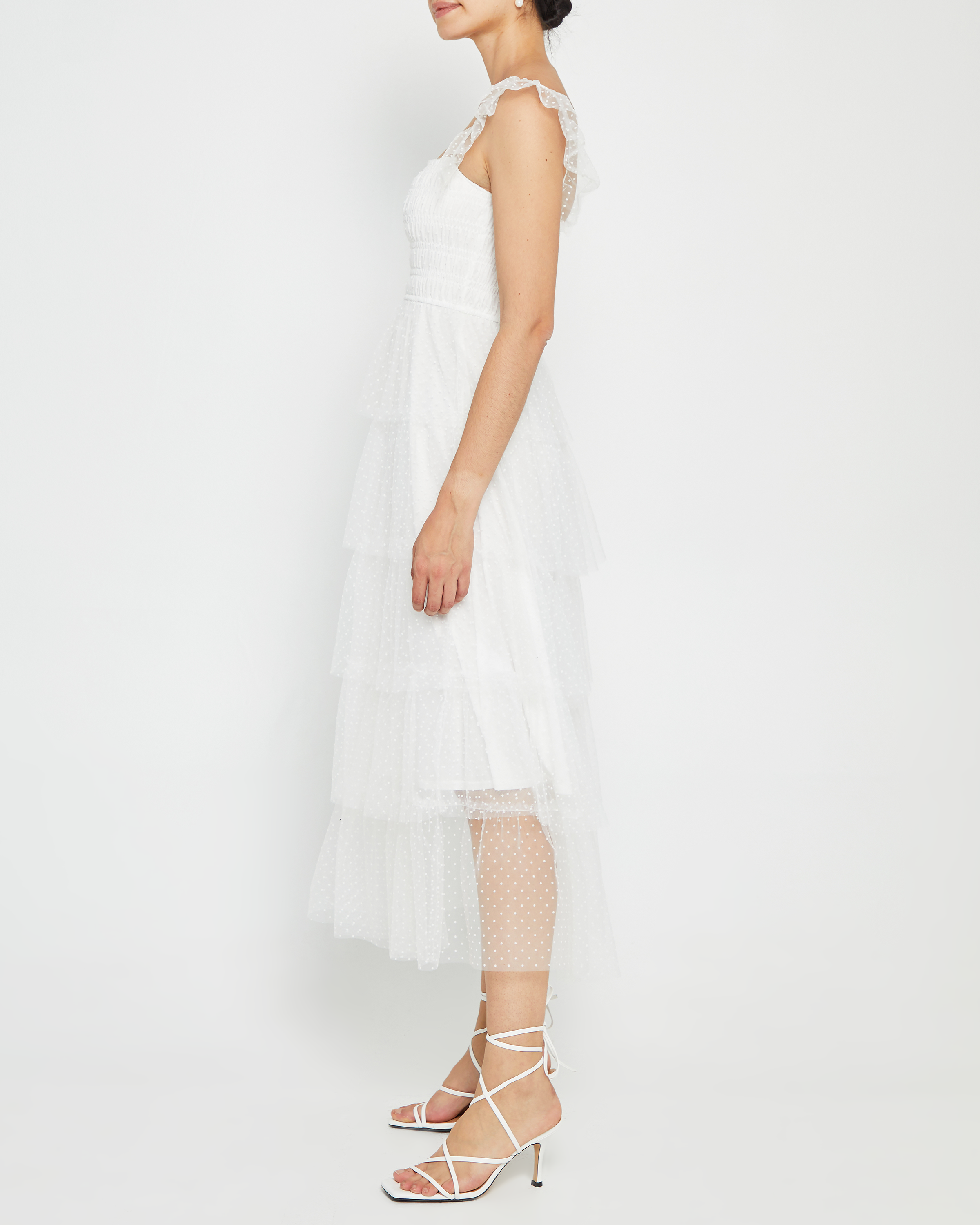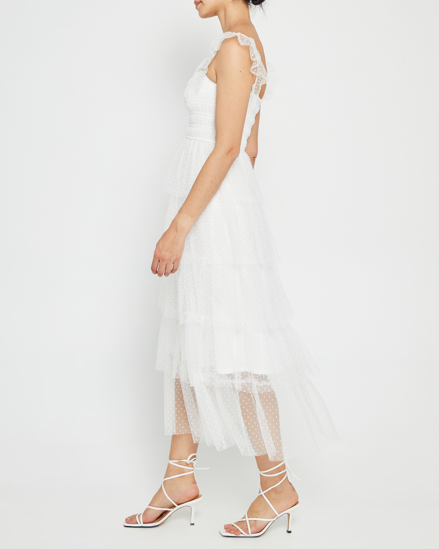 Full of frills, this tulle dress is absolutely dreamy. Done with tiers of airy white tulle with ruffled sleeves for an ultra charming look.