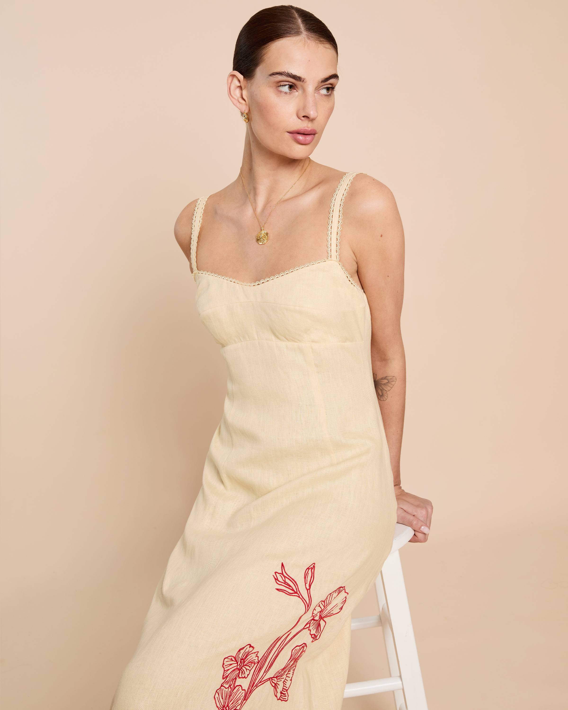 The Skye Linen Dress features a tailored bodice crafted from luxurious butter yellow linen fabric. The design is elevated with vibrant red floral embroidery adorning the skirt, creating a striking visual contrast. Delicate lace straps complete this sophisticated silhouette, offering both structural support and a charming detail.