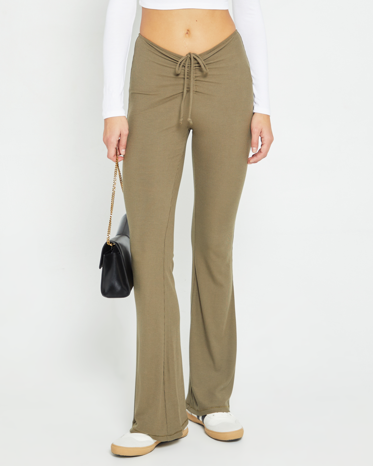 These Soft Lounge Ruched Pants offer a flattering fit with their flare cut and adjustable ruching. Their super soft and stretchy material provides comfort, while the elastic waist ensures a secure fit. Perfect for lounging in style.