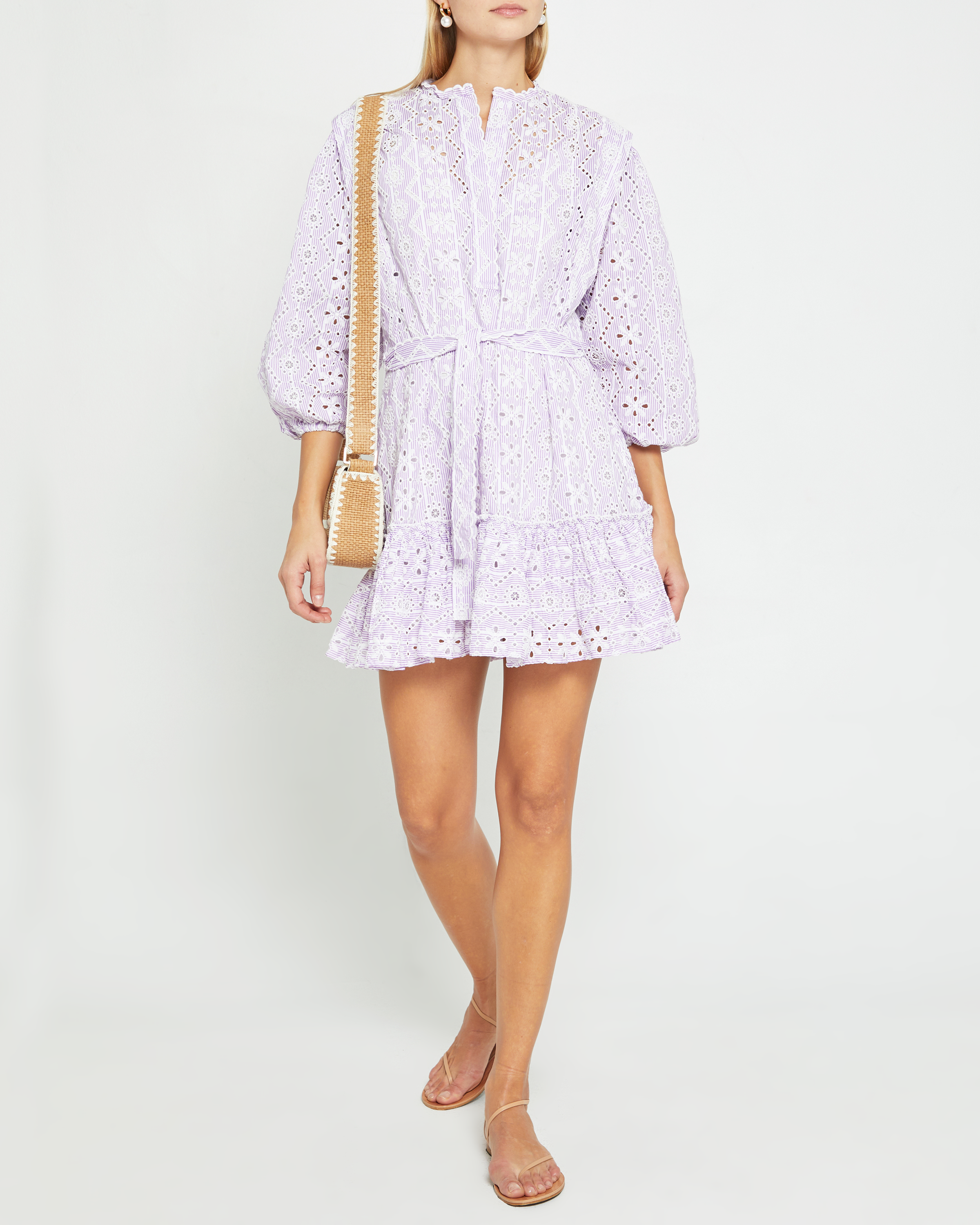 The Stratford Dress is a timeless piece with layers of intricate details. Delicate eyelet lace accents the lavender striped material, while puff sleeves and a ruffle finish add a touch of charm. The adjustable waist tie ensures a perfect fit, making this dress a must-have.