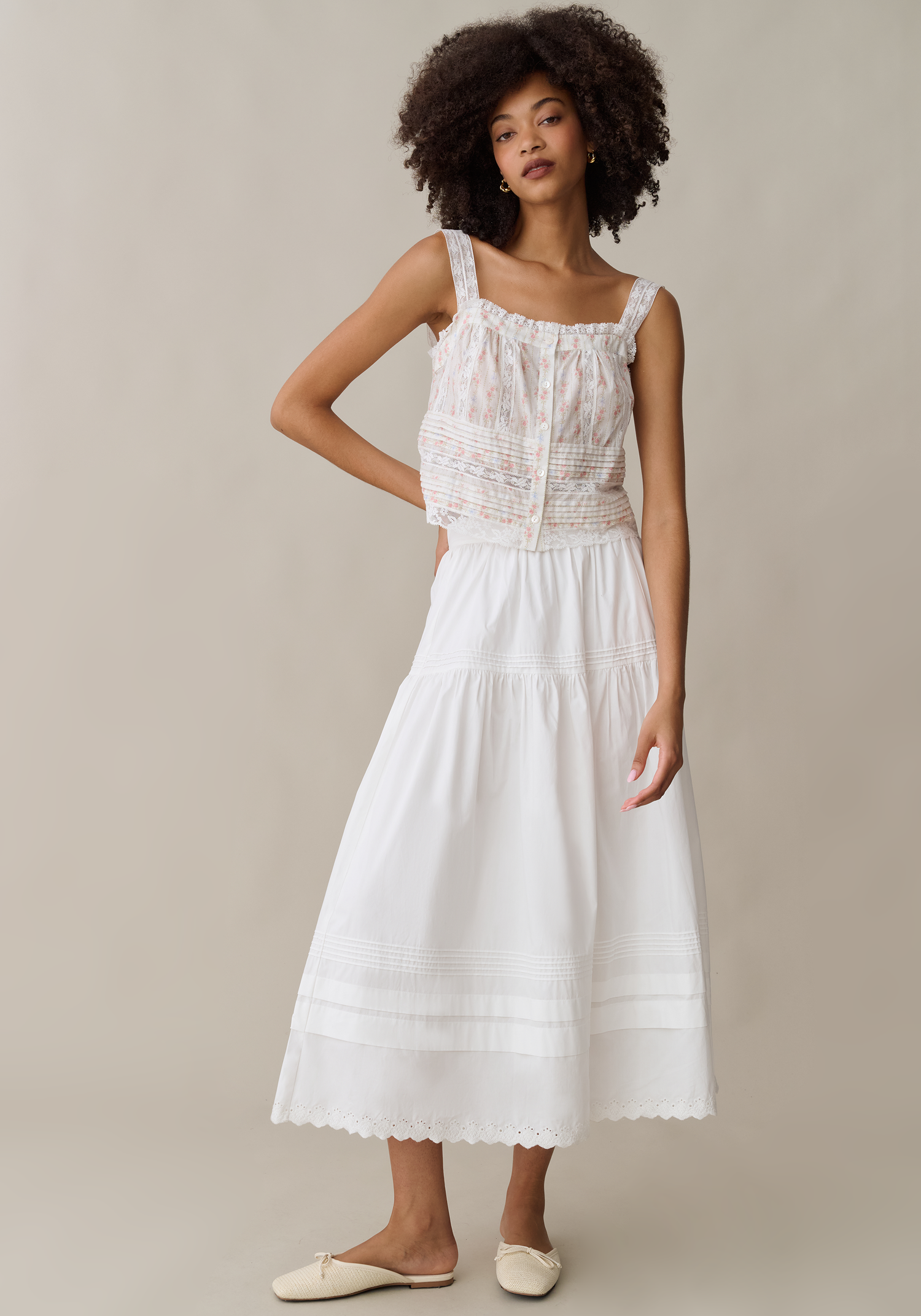 Done with a classic button-front placket and delicate lace straps, this top features an intricate mix of tonal embroidery and horizontal pintucks. The square neckline and sheer lace panels create a sophisticated, textured look that feels both vintage-inspired and effortlessly refined.