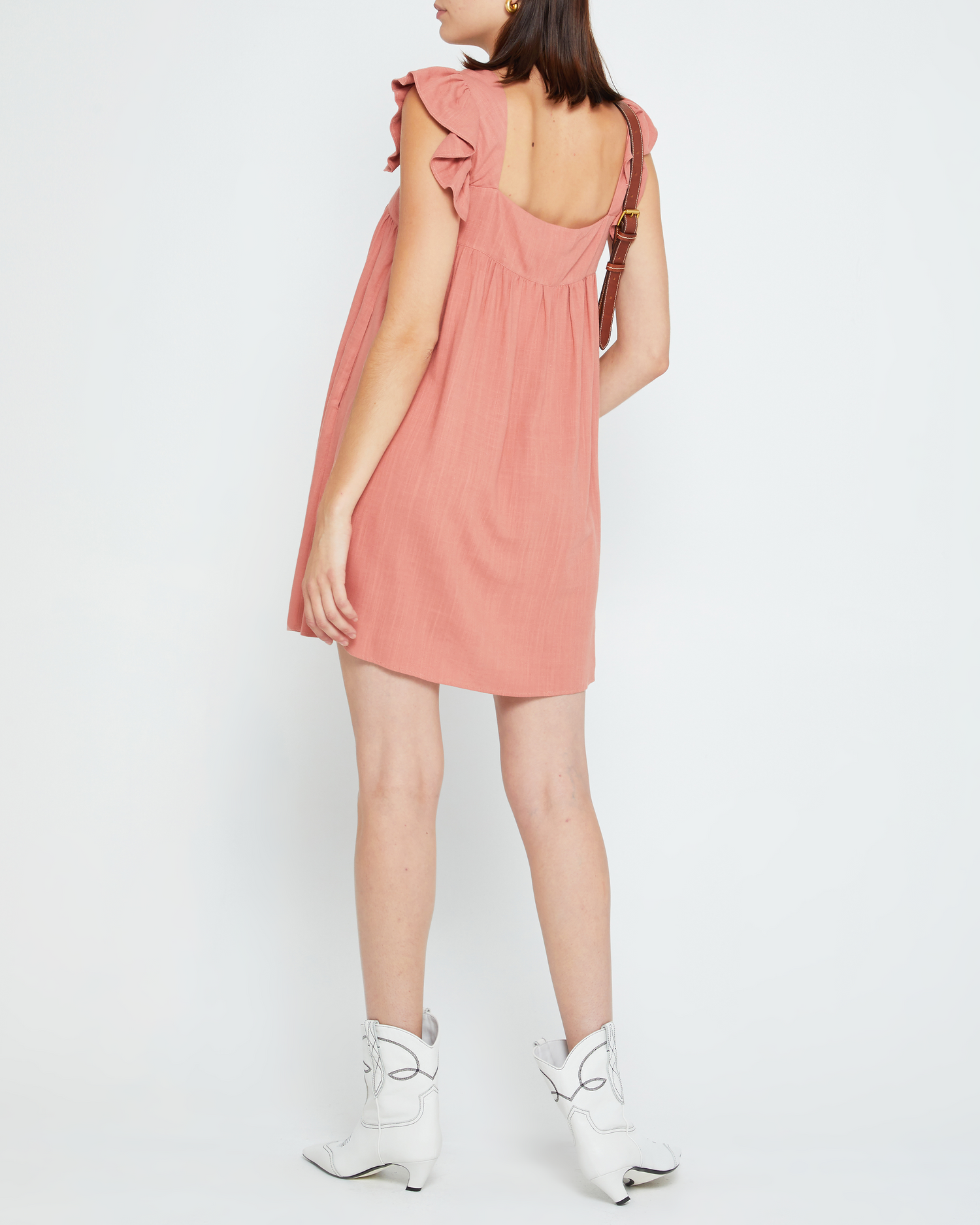 This perfect spring frock is made from a breezy linen blend. Done with a relaxed fit and structural square neckline to contrast the exaggerated ruffled sleeves.