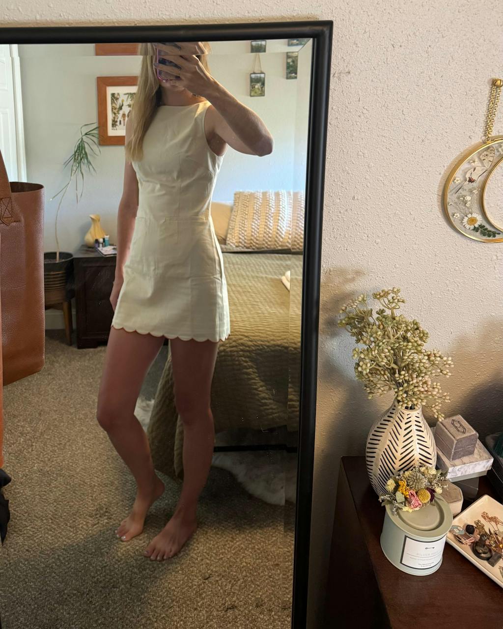 Meet the Charlotte Dress. The high neckline and figure-hugging fit create a sophisticated sheath silhouette, while the linen feel adds a touch of luxury. The adorable scallop hem, finished with a unique burnt orange edge, sets this dress apart from the rest.