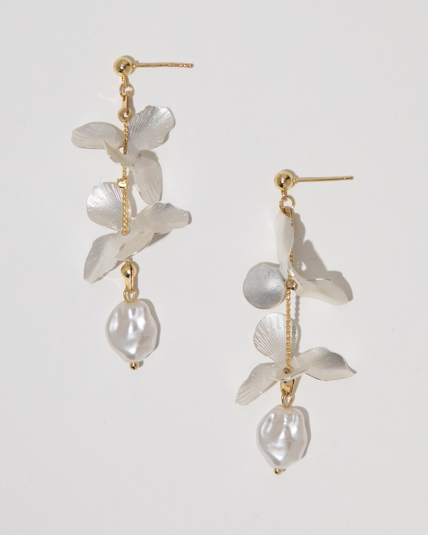 Like a piece of art, these gorgeous earrings add the finishing touch to any look. Mixed materials come together to create a stunning strand of flowers, finished with a pearl.