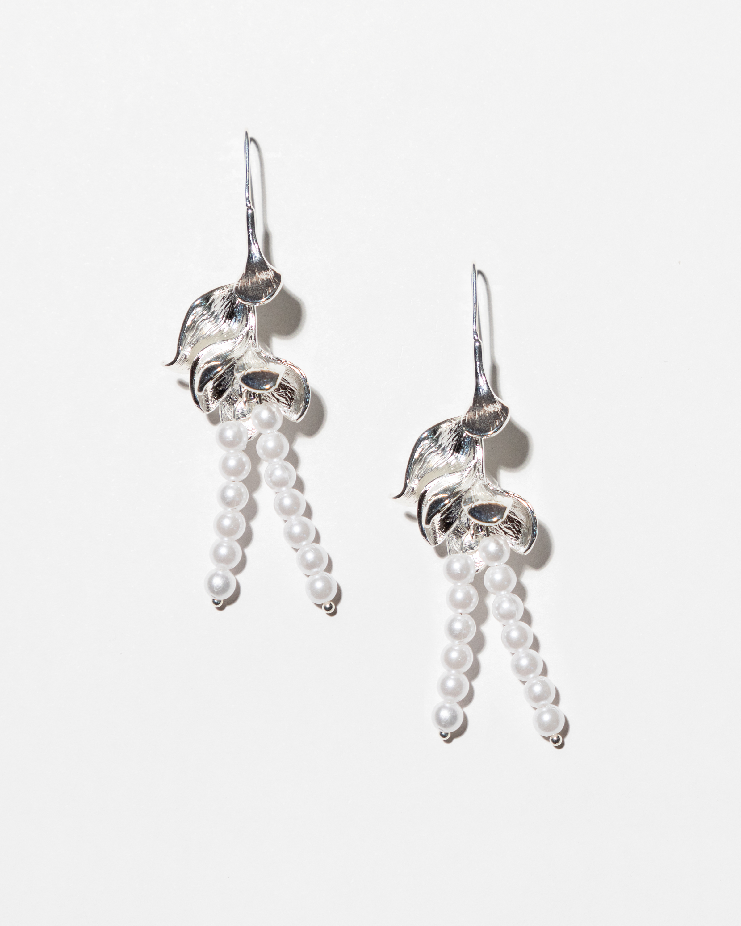 These Flower Petal Pearl Dangle Earrings feature a beautifully crafted cast silver flower, accented by dangling strands of pearls. Offering the perfect sweet statement, these earrings are a beautiful addition to any outfit.
