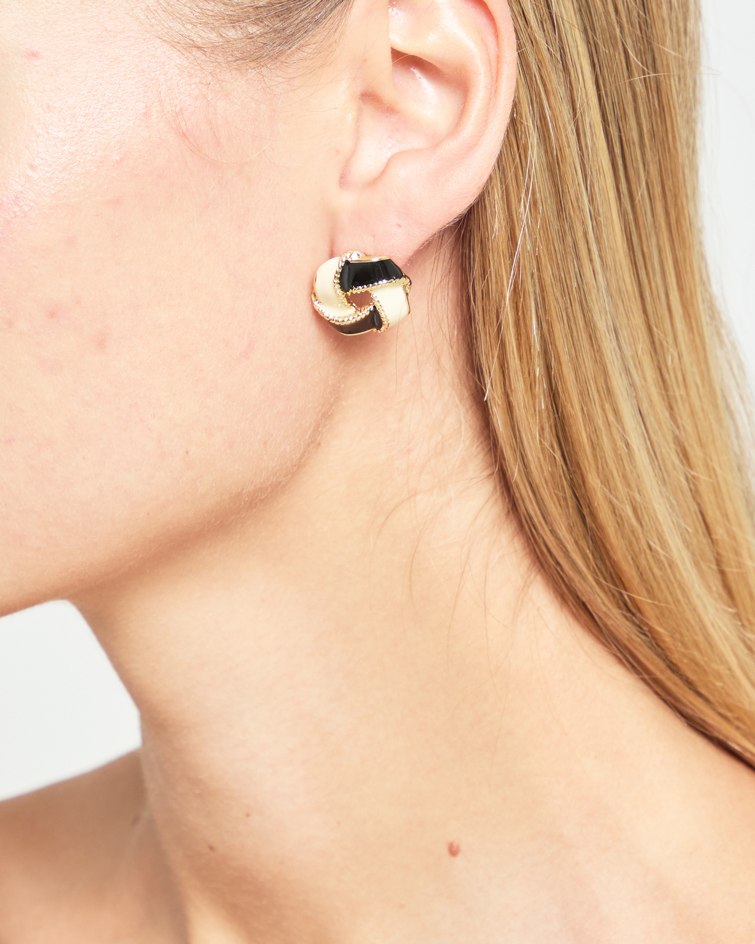 These Geometric Two-Tone Enamel Earrings feature a unique woven design in white and black enamel, making them easy to match with any outfit. Their chic and elegant style will elevate any look, making them a versatile addition to any jewelry collection.