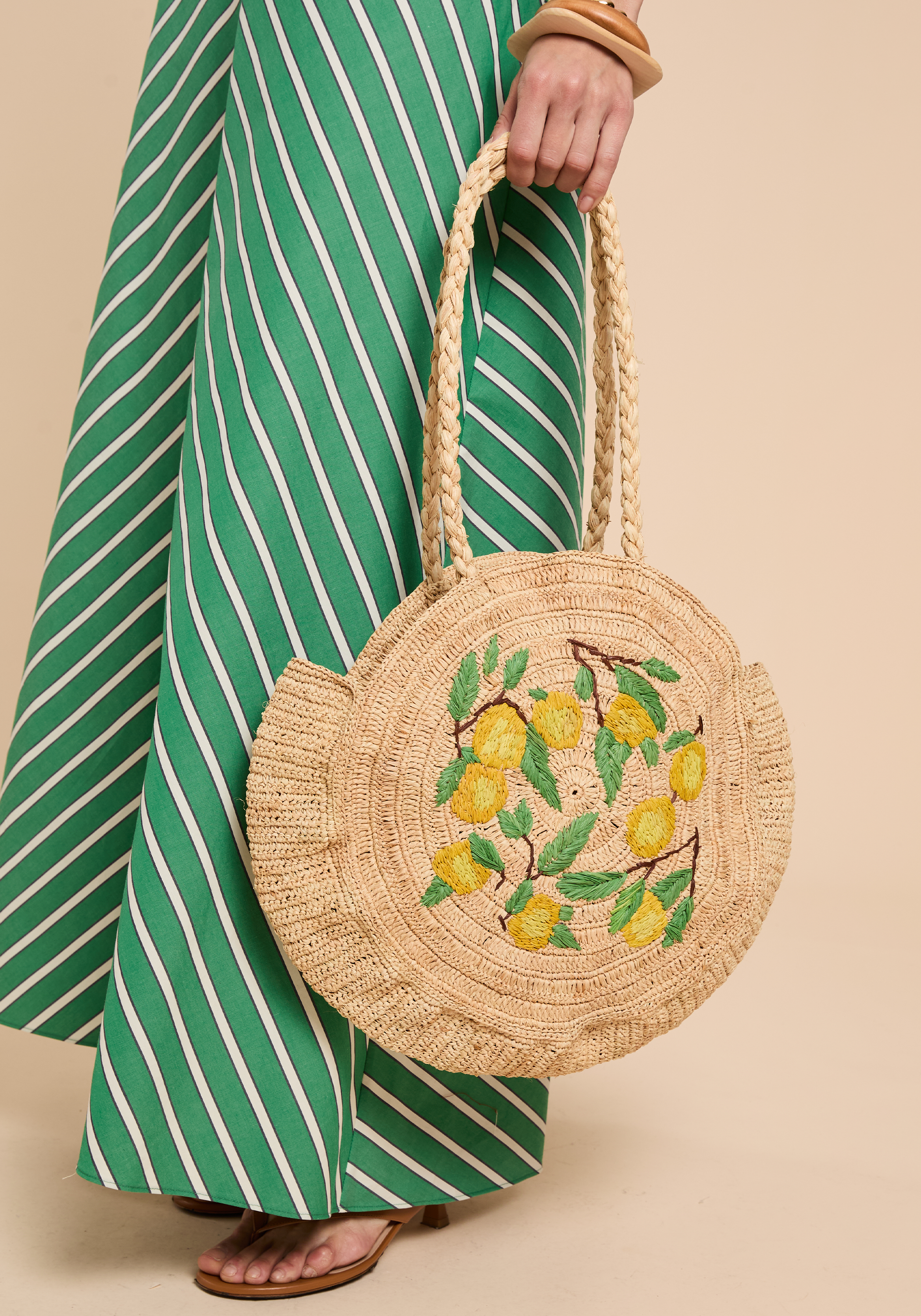 The Menton Handmade Raffia Bag is a stylish and lightweight straw tote, expertly crafted with a playful lemon design that captures the essence of summer. Made from natural raffia, this bag offers breathability and durability, making it perfect for sunny days and casual outings.