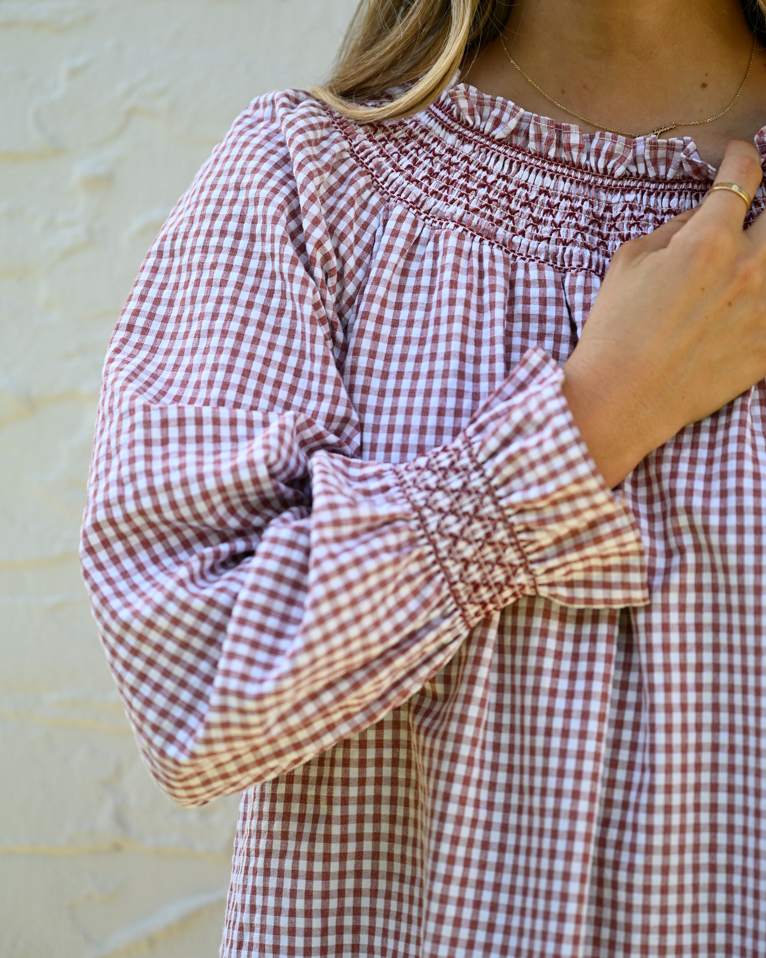 The Penelope Dress features a vibrant red gingham pattern complemented by delicate embroidery on the smocked cuffs and collar. Its long sleeves and loose mini silhouette provide a relaxed, comfortable fit, perfect for effortless style. This dress combines charming details with an easy, laid-back feel, making it an adorable choice for any occasion.