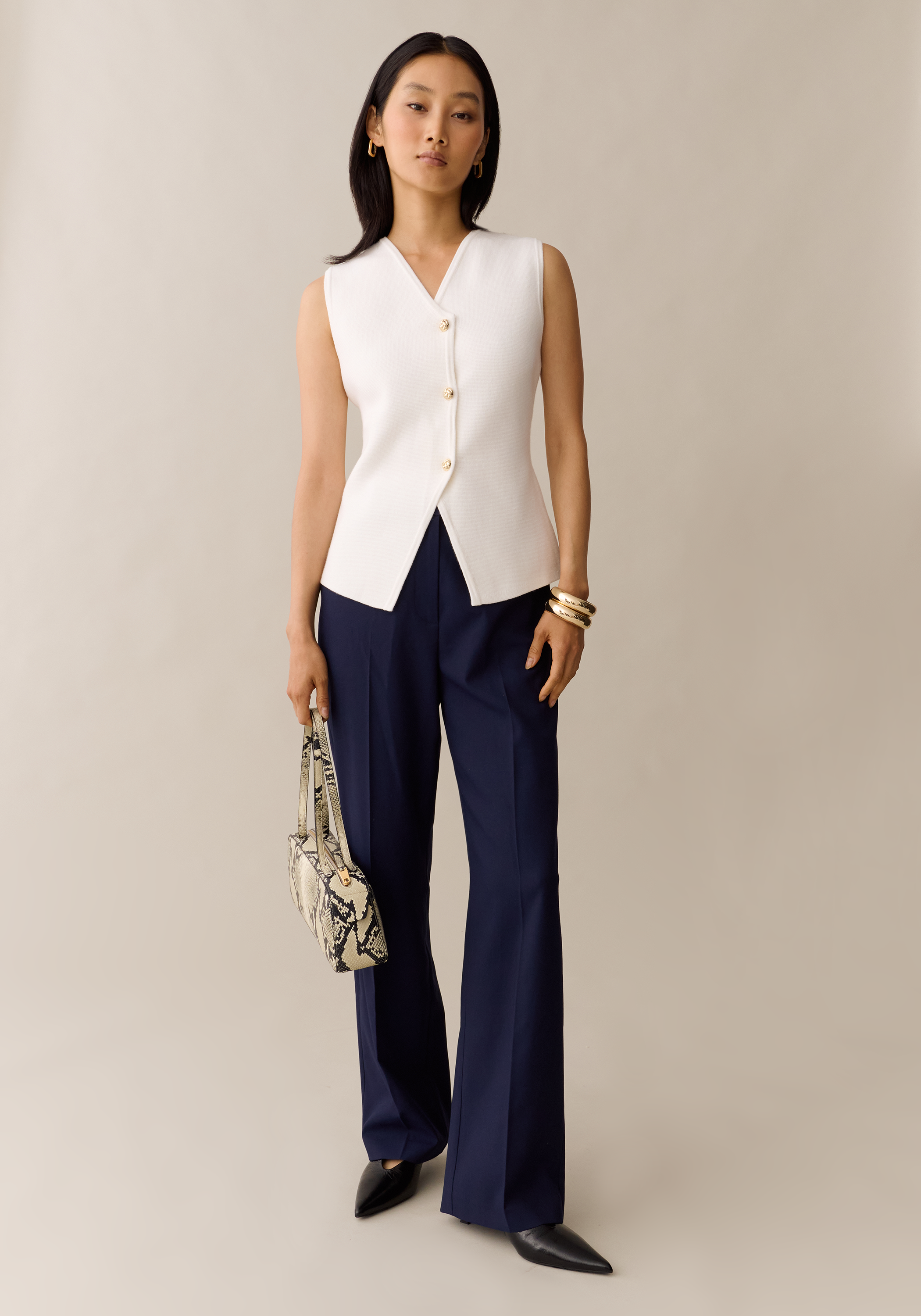 The Rienne Knit Top combines cozy, thick knit fabric with a sophisticated wrap design secured by elegant gold button closures. This versatile piece transitions effortlessly from work to weekend, offering both comfort and polished style for any occasion.