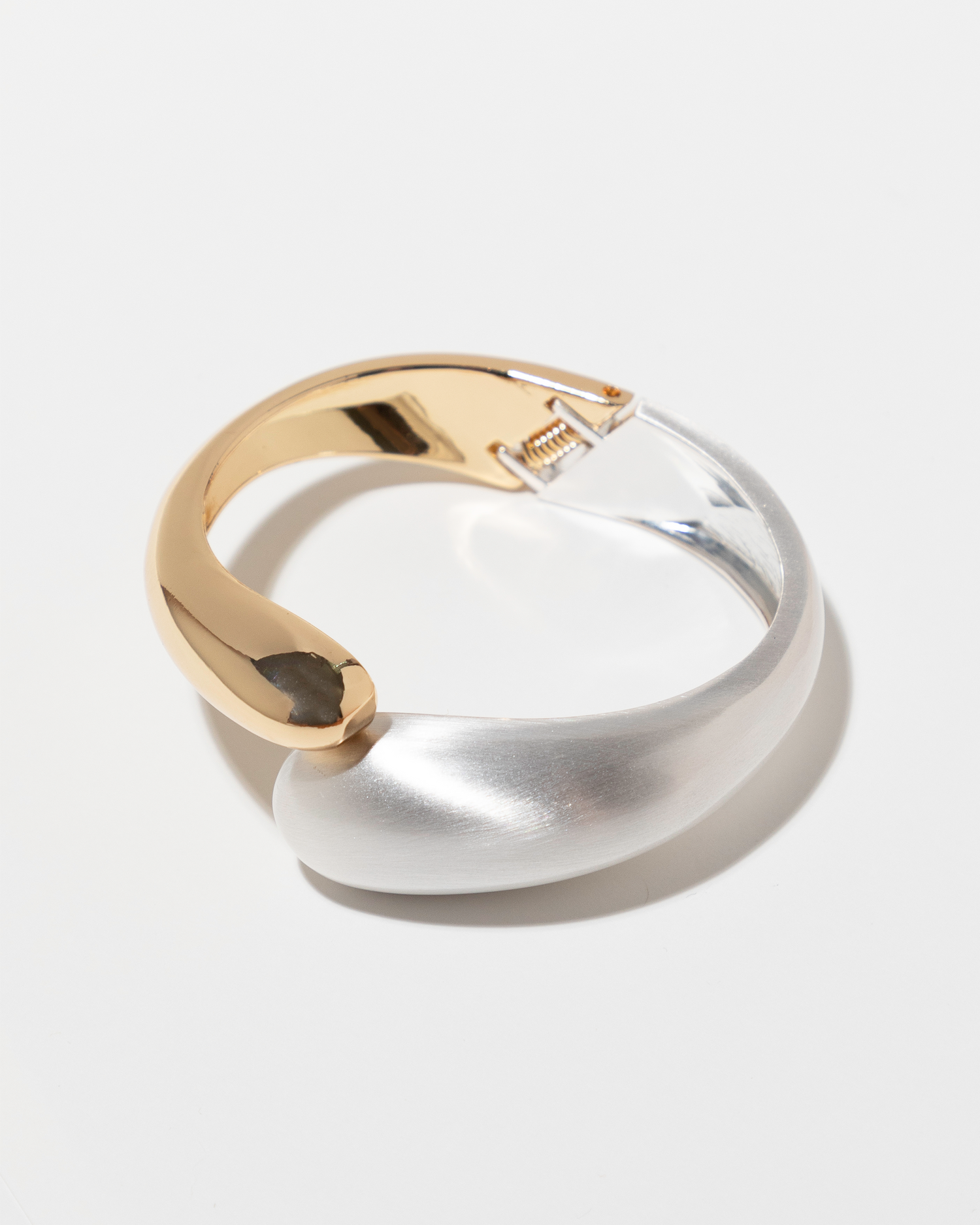 Brushed silver and lustrous gold meet to create a unique and eye-catching design. Its hinged cuff style makes it easy to put on and take off, and its versatile design allows it to effortlessly match any outfit. Elevate your style with this must-have accessory.