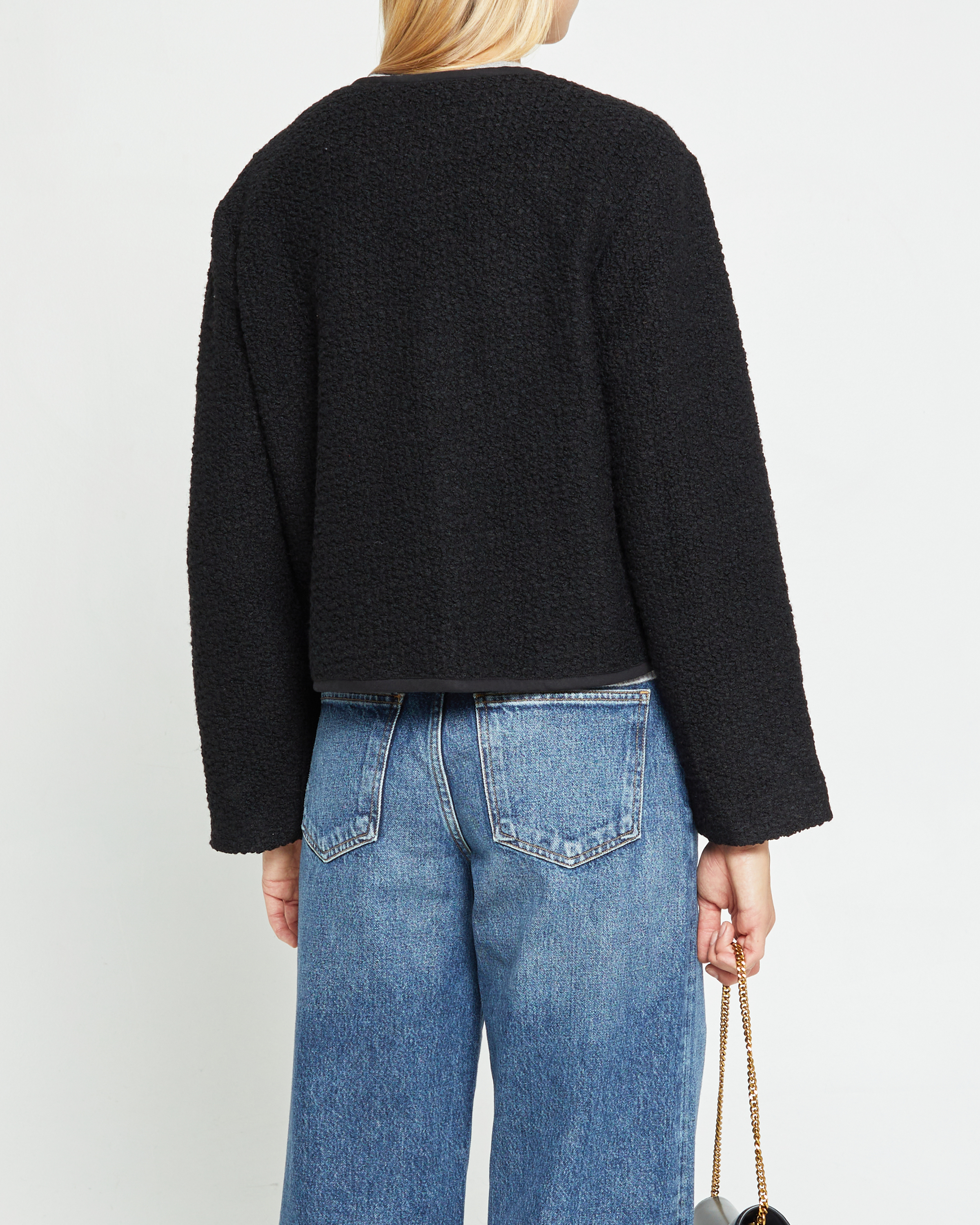 Introducing the Joe Cropped Jacket, a sophisticated and chic piece of outerwear. Made of a classic tweed-like material and detailed with gold buttons, this elegant design offers a timeless, cropped silhouette for a graceful look.
